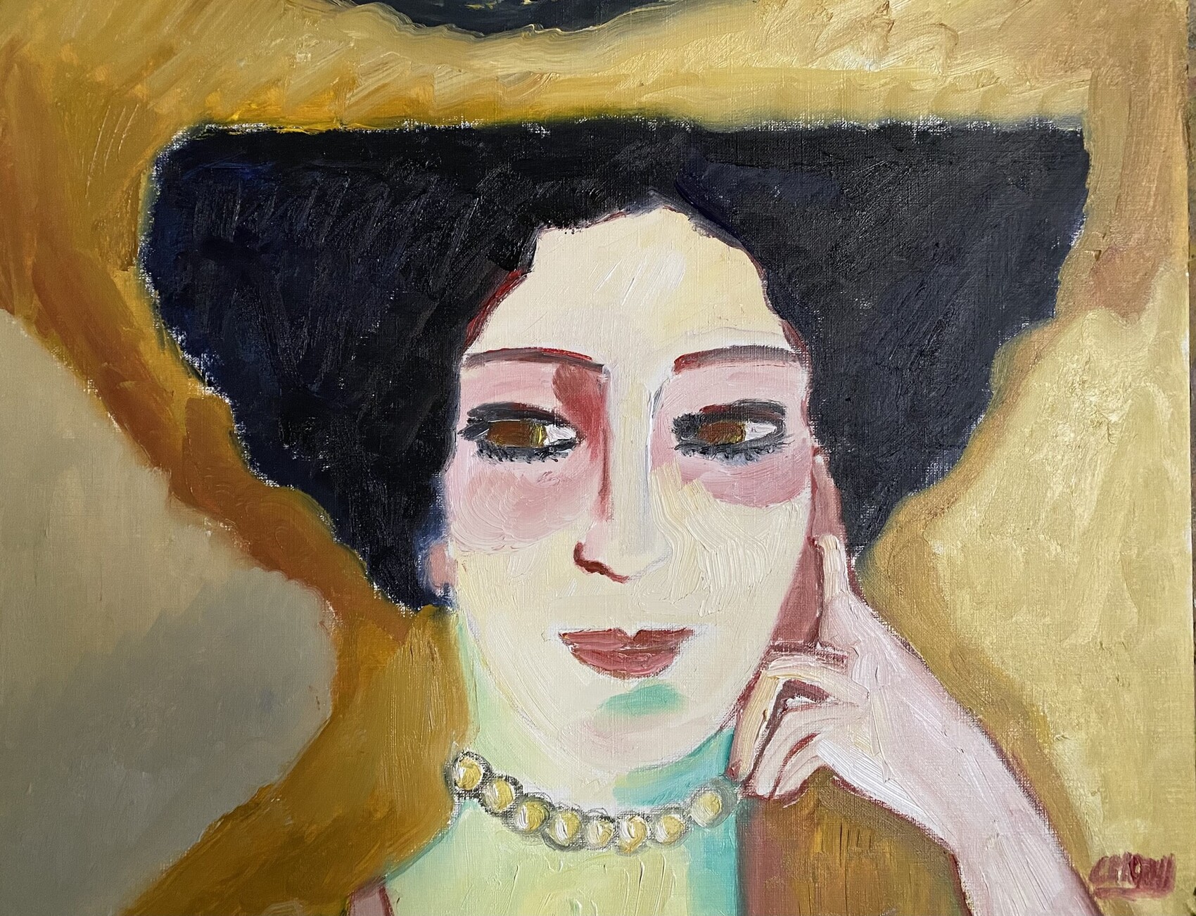 Huile sur papier 38/46. Le 15/03/25. Bien à vous, je vous présente, interprétée d'après une oeuvre de Kees Van Dongen, ( "Le chapeau fleuri"), cette toile que j'ai nommée "Charmeuse" .... Amicalement, Claire.