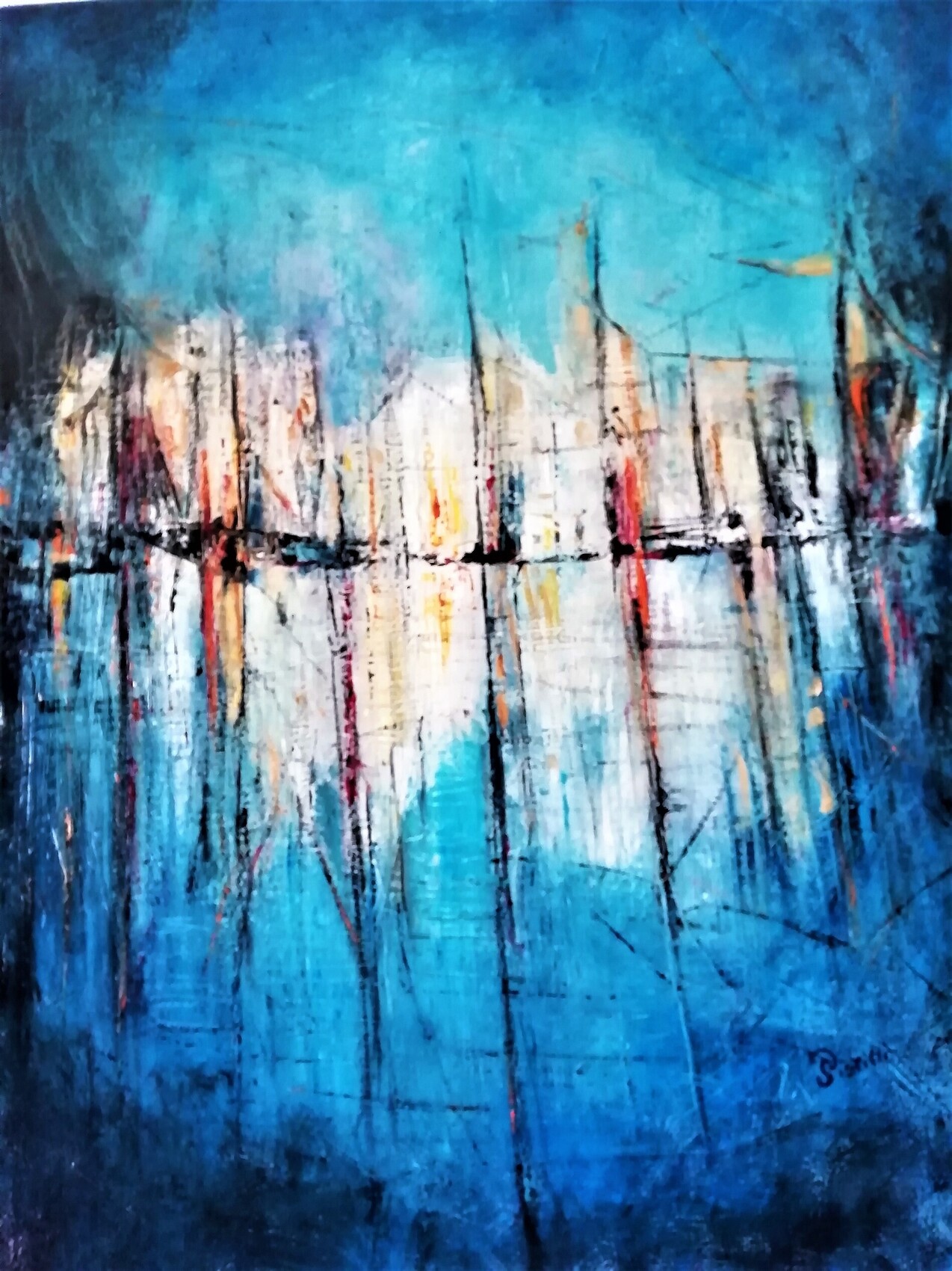 Ce tableau est à double détente, paradisiaque cocktail Blue Lagon et en réverbération, diabolique champ marin pétrolier. Peint en 2014 mais tt à fait d'actualité au moment où les gds fonds marins viennent d'être interdits de prospection pour ceux qui veulent bien y croire. Lumineux et graphique, alors conservons Blue lagon à l'esprit. Bonne nuit Yann.