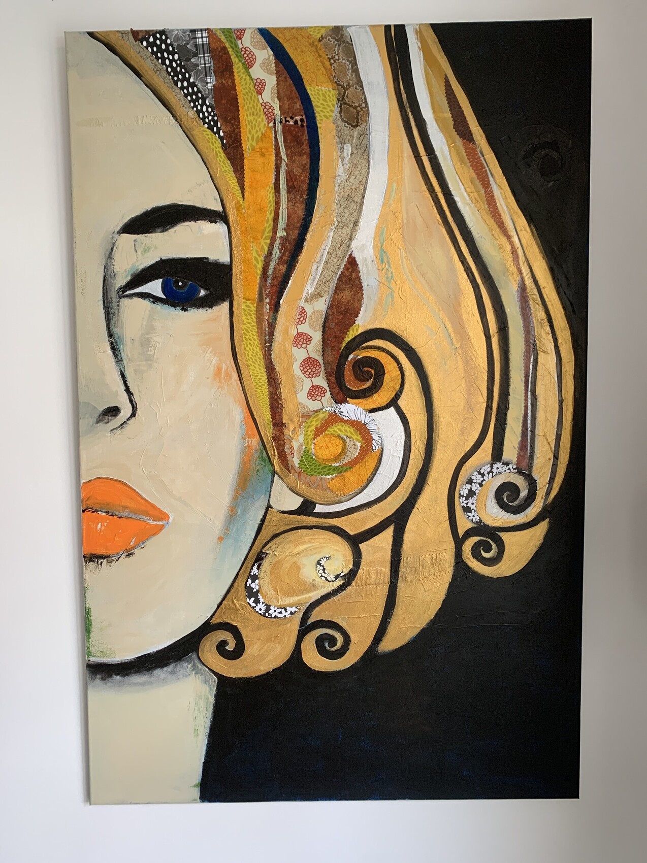 Portrait de femme blonde. 76x116cm Technique mixte sur toile : peinture acrylique et collage. Juin 2023
