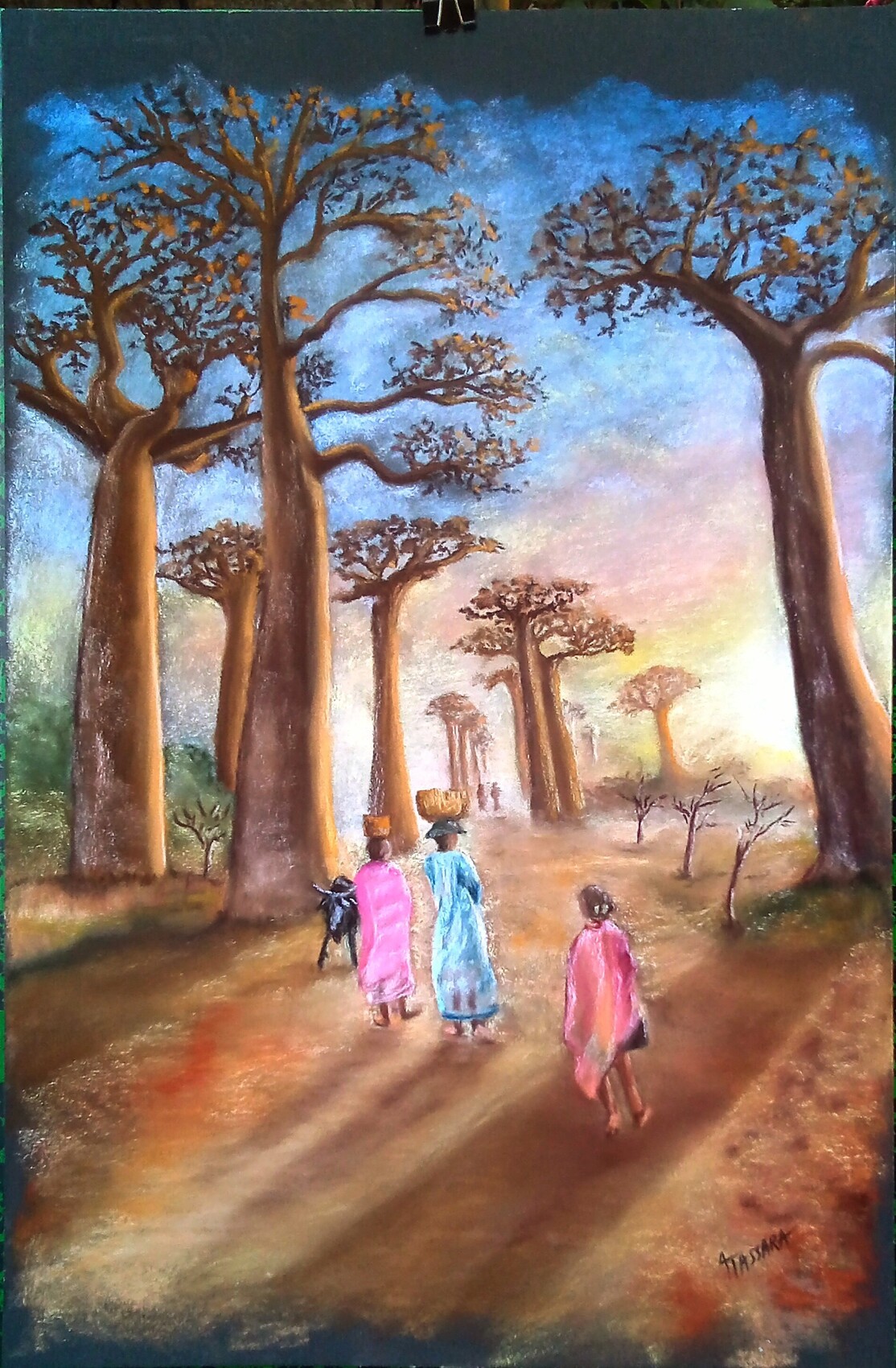 Paysage d'Afrique les grands baobabs et la promenade au soleil couchant. Pastel sec Dimensions 35 cm x 45 Signé