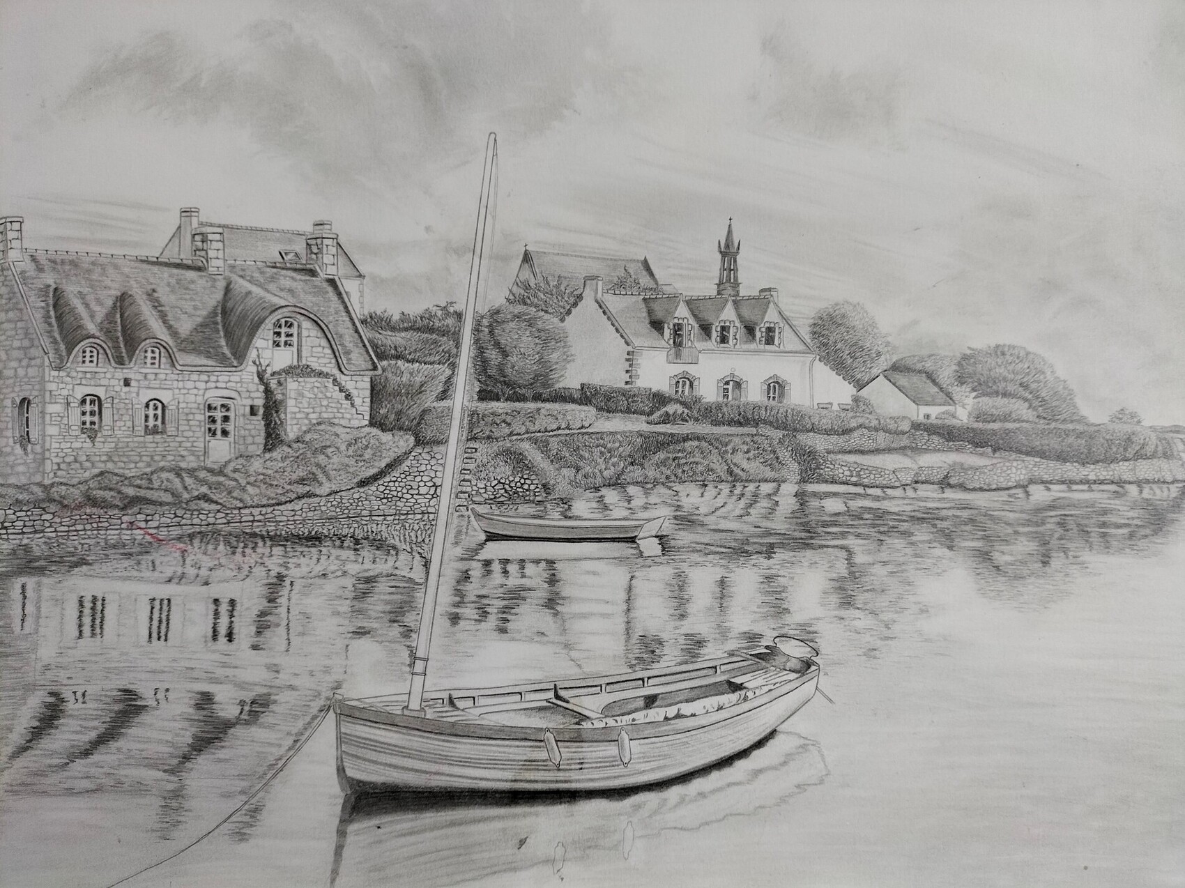 reproduction au crayon à partir d'une carte postal. Paysage Loire Atlantique.