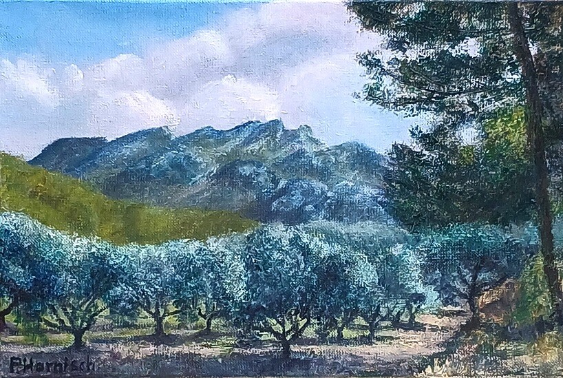 Champs d'oliviers devant les Alpilles . Huile sut toile de lin, format 33 cm x 22 cm .