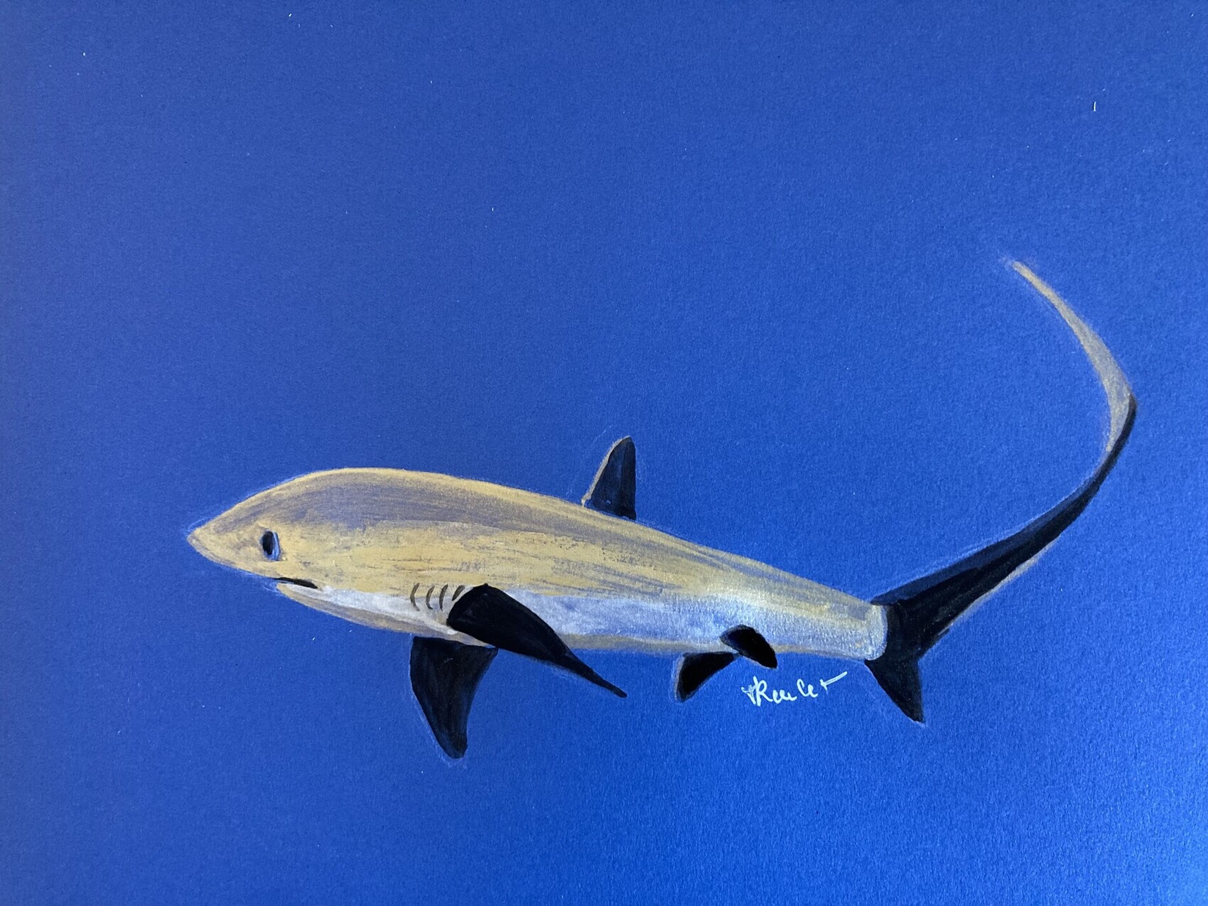 Gouache, mars 2025, 29 x 35 cm. Requin ayant la particularité d’avoir une queue faisant la moitié de sa longueur et de gros yeux = Muriel Reulet = Gouache paint, 2025. Shark with a tail half its length and large eyes.