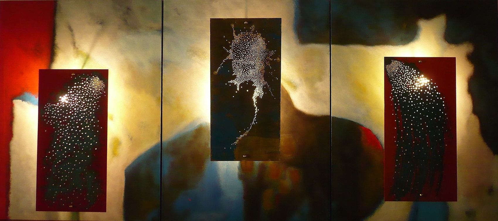Triptyque allumé.Peinture acrylique sur bois pour le fonds et au premier plan plaques d'aluminium laquées et perforées avec feuilles de cuivre oxydées pour celle du milieu.Format 180*80*10.