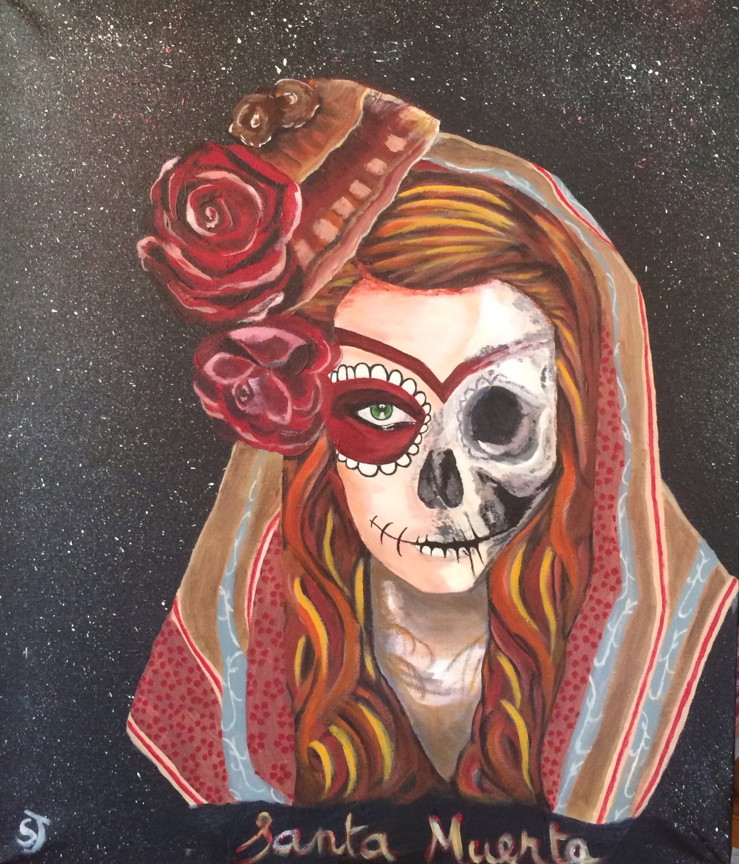 Peinture acrylique représentant la célèbre Santa Muerte mexicaine, représentation féminine de la mort ( la faucheuse étant la représentation masculine) Inspirée d'une affiche de festival musical, modifications personnelles