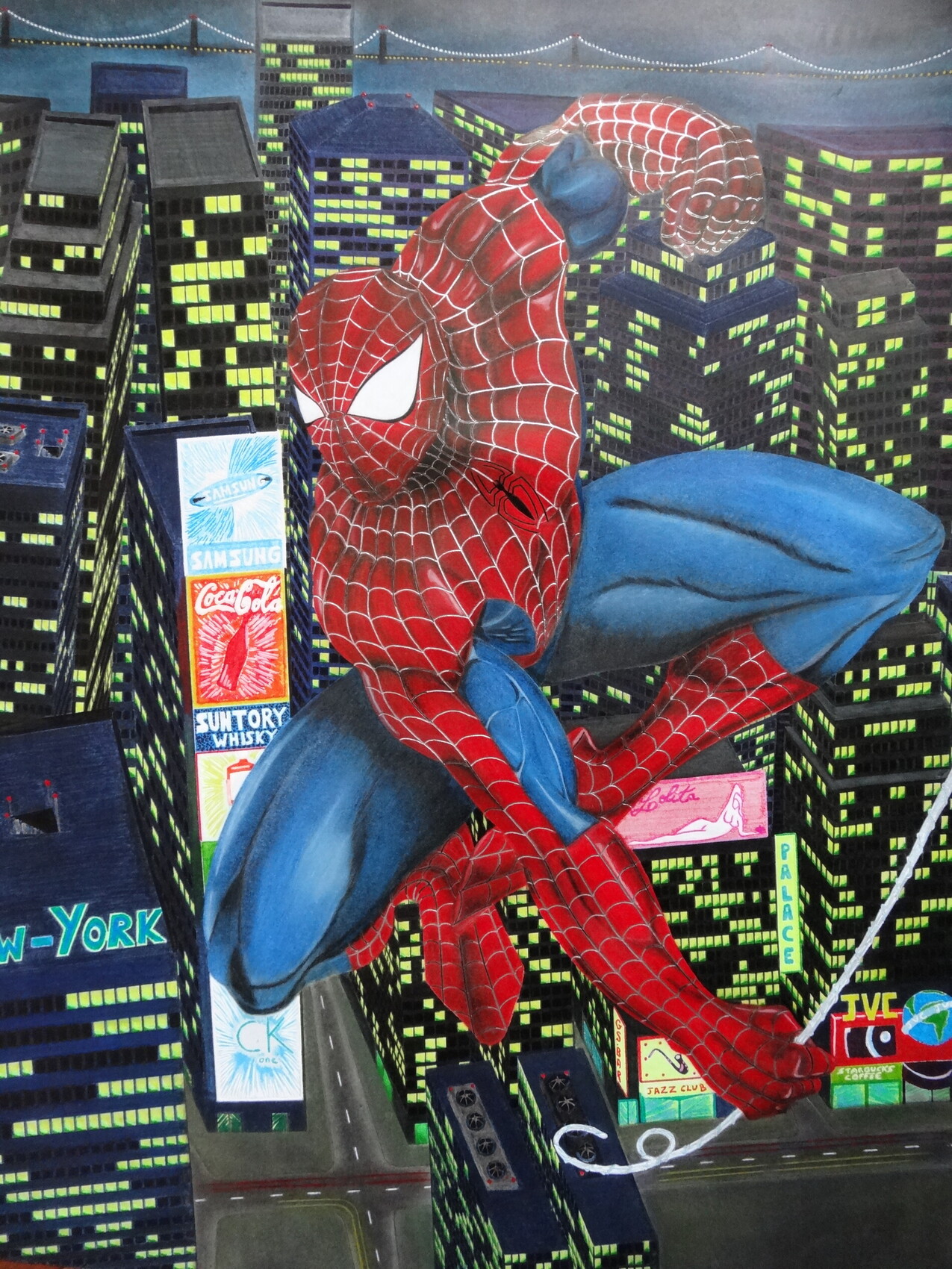 Spiderman est une reproduction en format A3, à partir d'une petite image. base au crayon, puis couleurs pastels à base de cire.