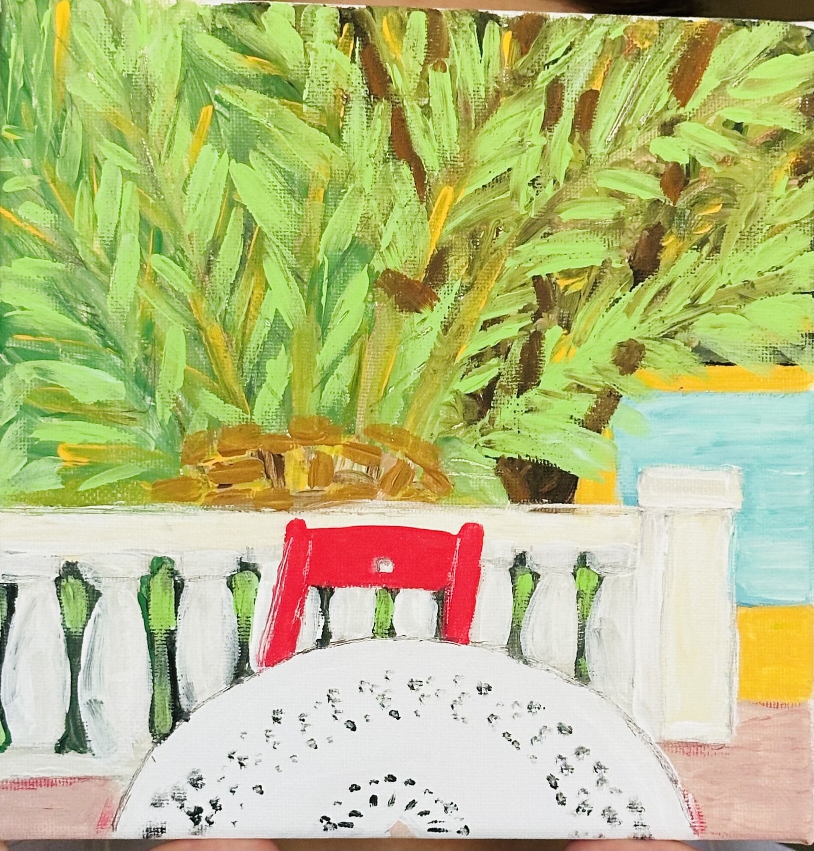 Terrasse ramadienne sa piscine et ses palmiers à midi