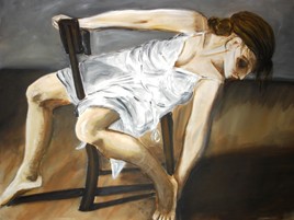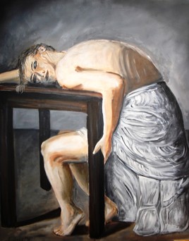 nue drapée assise à une table