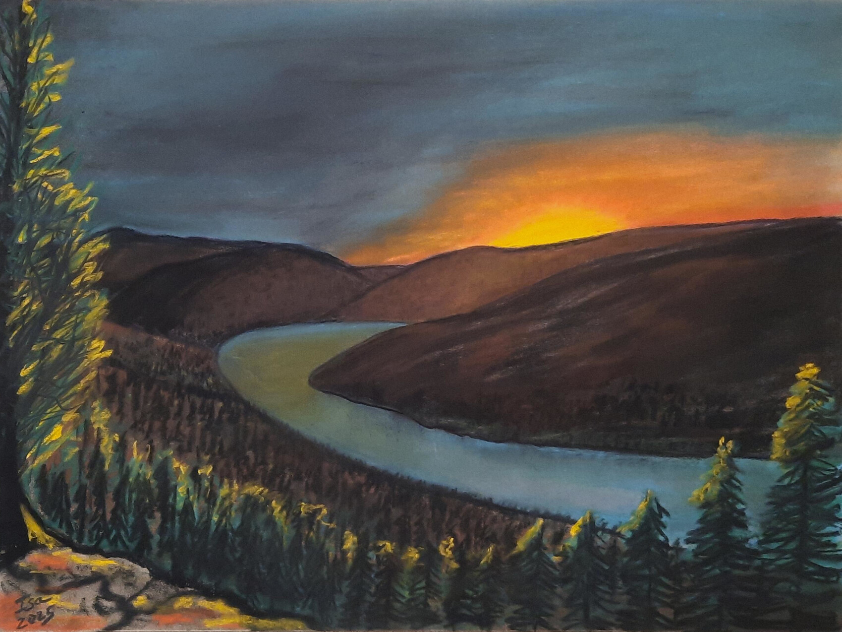 "Éclats du couchant sur les cimes et la rivière paisible"