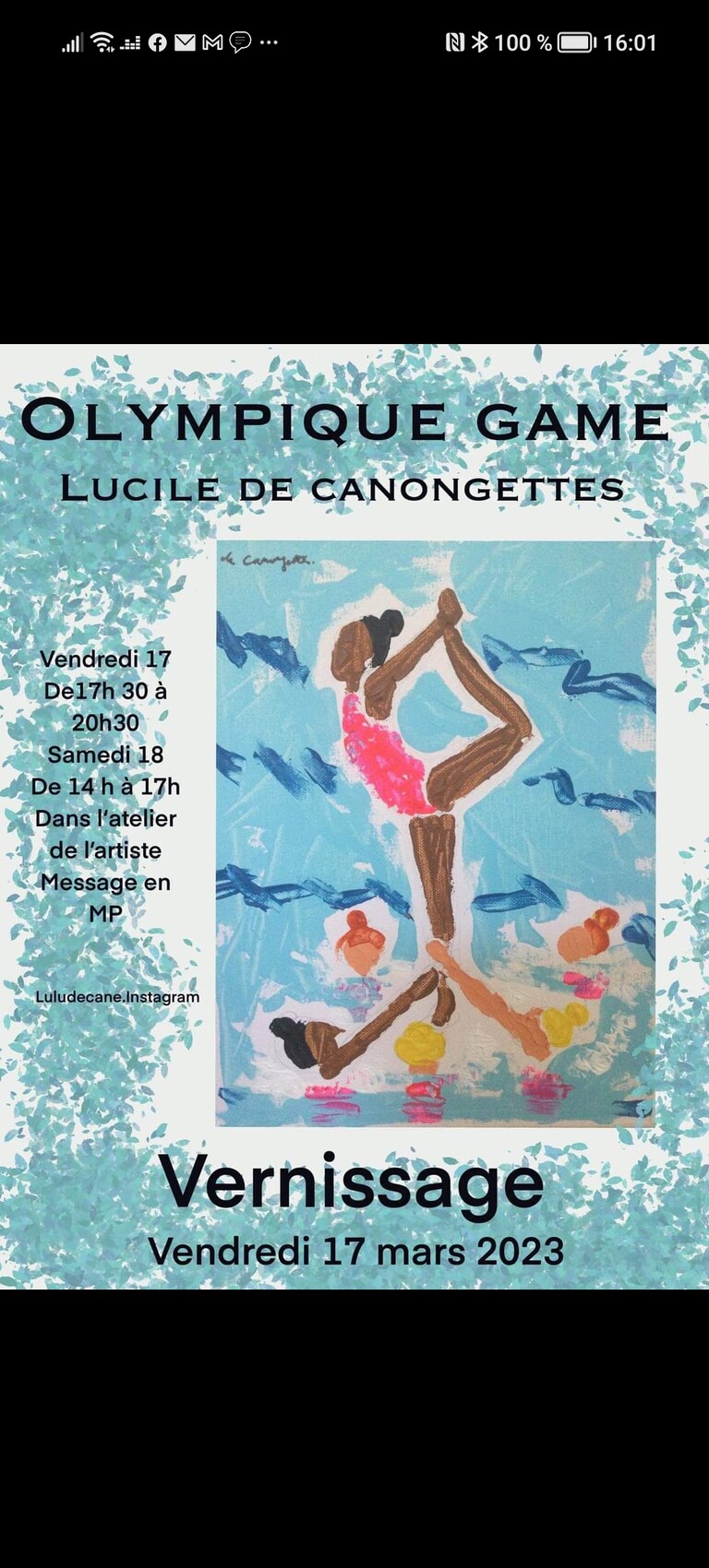 Exposition sur le thème des jeux olympiques qui se déroulera a Paris, l été 2024. Je travail ce theme du sport au couteau à peindre, a l acrylique, depuis février 2022.