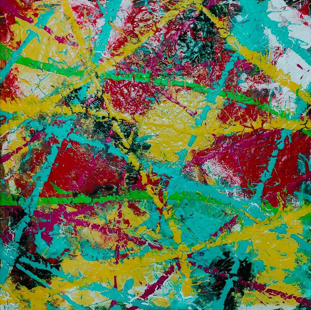 Cette peinture explose de couleurs vives et saturées, créant une composition vibrante et énergique. Les différentes teintes - des rouges passionnés, des jaunes éclatants, des verts profonds et des bleus électriques - se mélangent et se chevauchent sur la toile, formant un tableau foisonnant et dynamique. Les coups de pinceau audacieux et gestuels donnent une texture irrégulière et mouvementée à la surface, reflétant un processus de création spontané et expressif. On peut voir les traces des