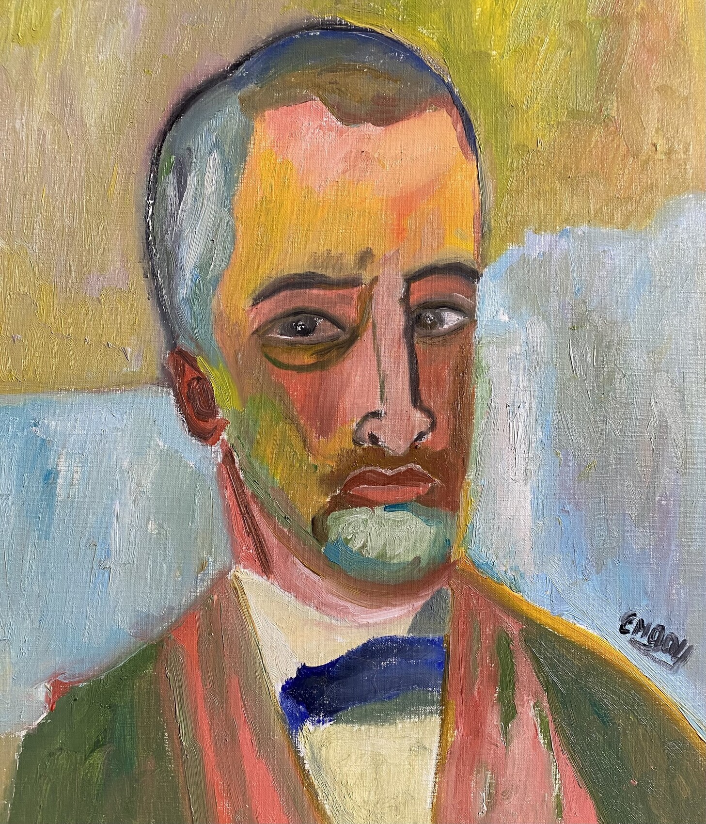 Huile sur papier 46/38. Le 20/10/23. Bien à vous, je vous présente le portrait que j'ai réalisé, d'après l'un des autoportraits de ce peintre Suisse, "Cuno Amiet". Amicalement, Claire.
