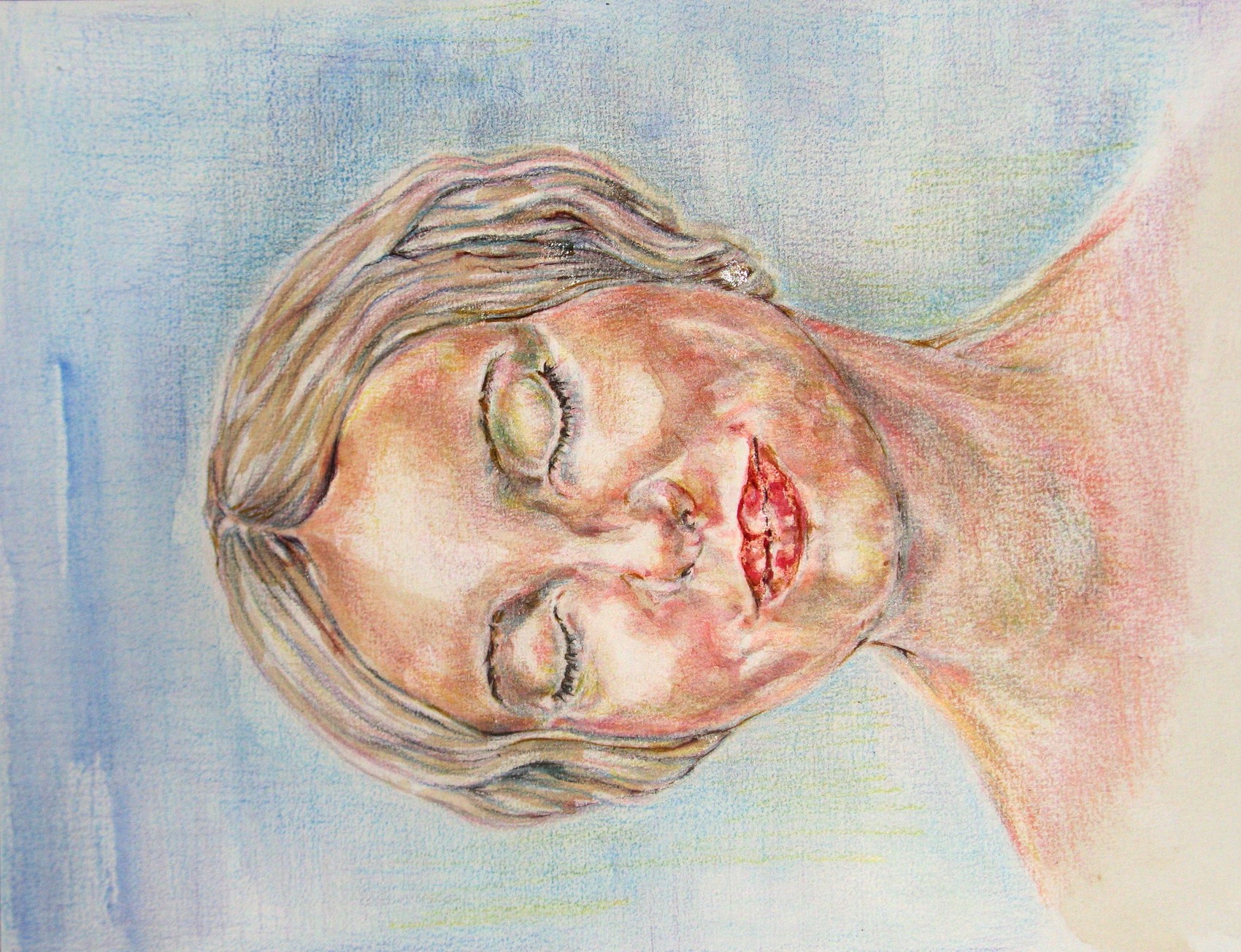 Dessin crayons ayant comme modèle l'Inconnue de la Seine. "Demain, dès l'aube, à l'heure où blanchit la campagne..." Victor Hugo. Dessin dédié à tous ceux et celles qui ont perdu un être cher.
