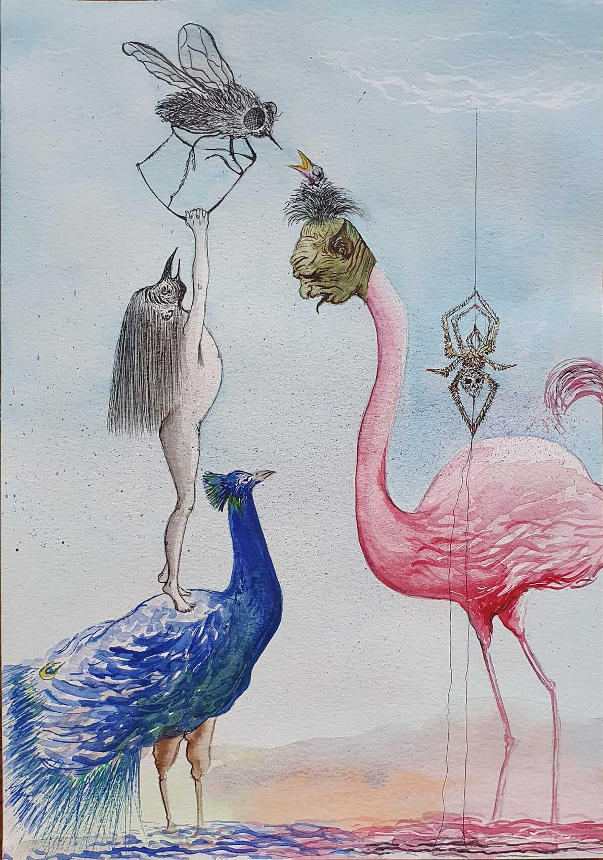 A Bruxelles l'été en juillet/août 2022 au musée d'art fantastique, exposition collective "Trolls et Bestioles". À cette occasion mon dessin intitulé "Dilemme cornélien" a été reproduit et visible en grand format. Aquarelle, acrylique et encre sur papier canson 300g, 21x29.7 cm.