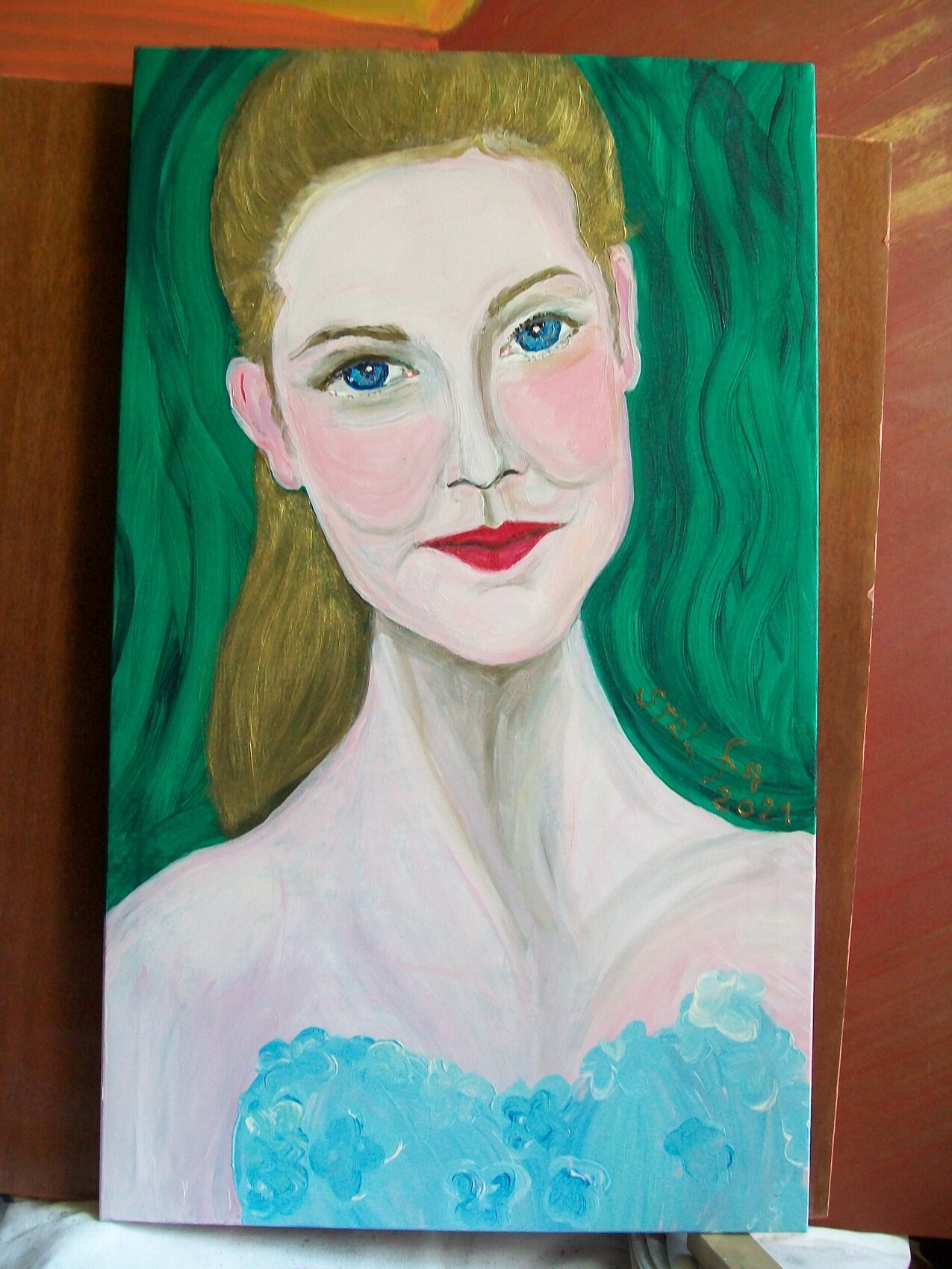 Un portrait qui dégage d'une douceur comme le personnage, j'aime bien les couleurs, surtout la robe bleu mer fraîche, en harmonie, avec sa blondeur capillaire, un fond vert, une actrice adorable, jeune en âge, mais sage en esprit, bravo Elle, a bien dit, en analysant, les conséquences de la pandémie et l'avenir de la société, surtout en particulier pour la jeunesse, qui est un futur espoir d'une nation, magnifique portrait, d'une Elle Fanning, en plus âgée un peu, bravo.