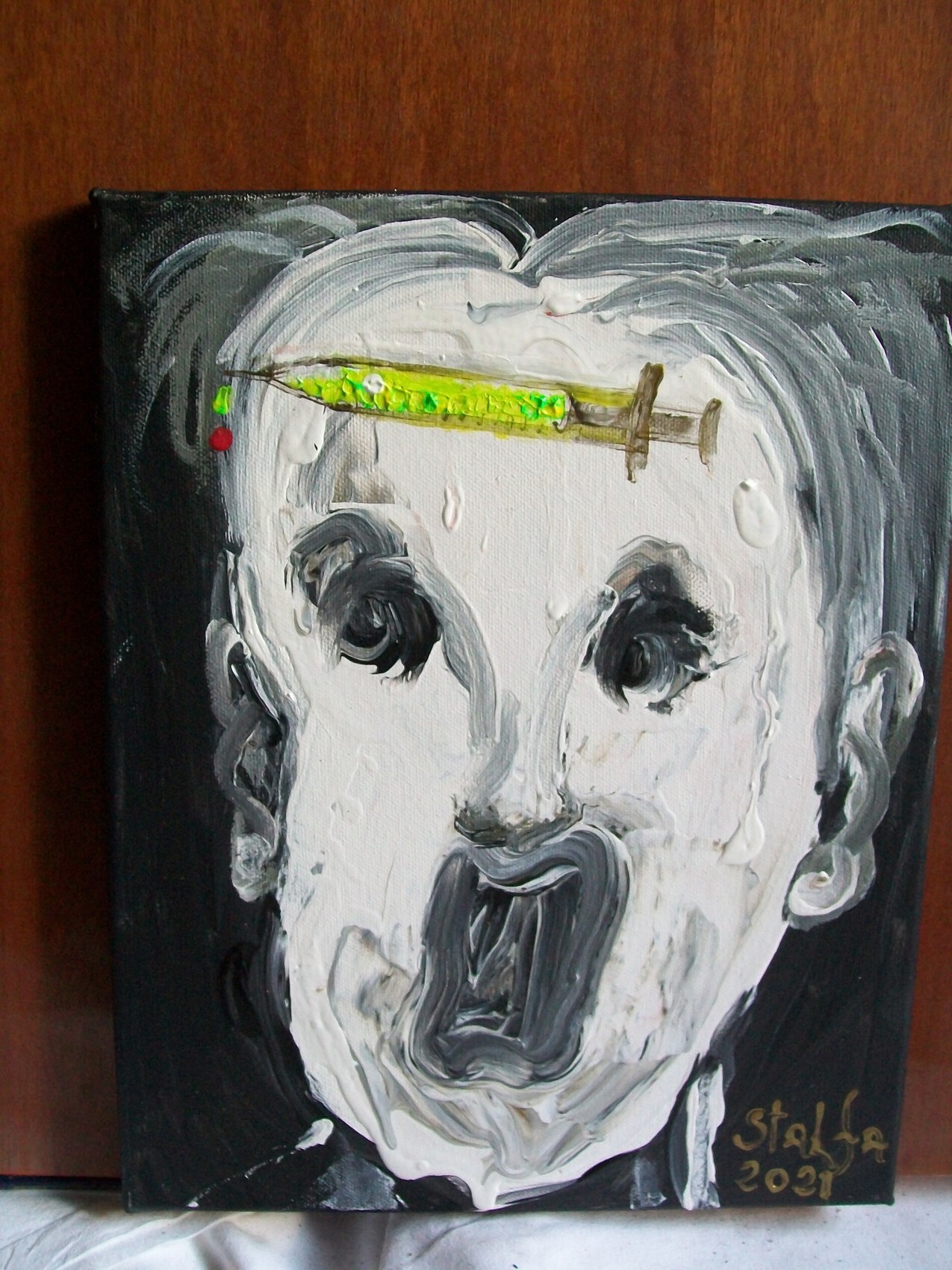 Acrylique sur toile de 35 cm par 28 cm par 1,8 cm , inspiré du nouveau variant Omicron , de la baisse probable du système immunitaire naturel à cause des premiers pseudo vaccins distribués à tout va , même à ceux qui n'en avait point besion .... et de la peur panique qu'elle inspire ... Peint par Stal Fa , à Montpellier , Occitanie , France , le 27 novembre 2021 . ( soleil froid )