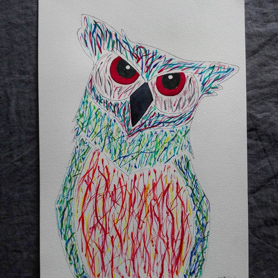 une autre façon de travailler l'aquarelle et qui me plait bien...voilà un hibou bien sympathique ...bravo !