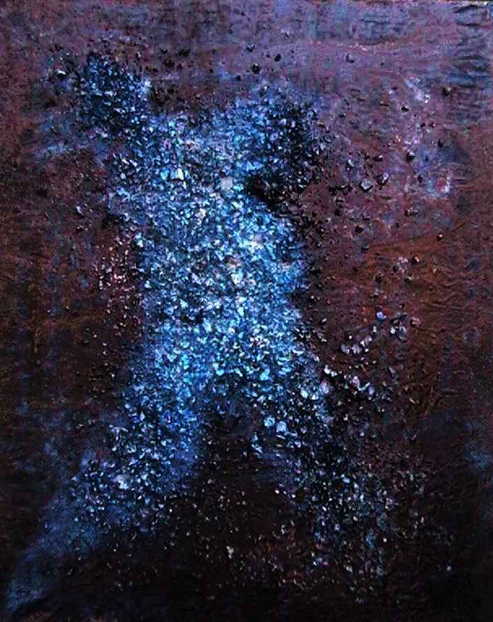 Sur une toile de soie, tendue sur cadre 81cmx65, j'ai collé du cristal pilé.Le fond est peint à l'huile.