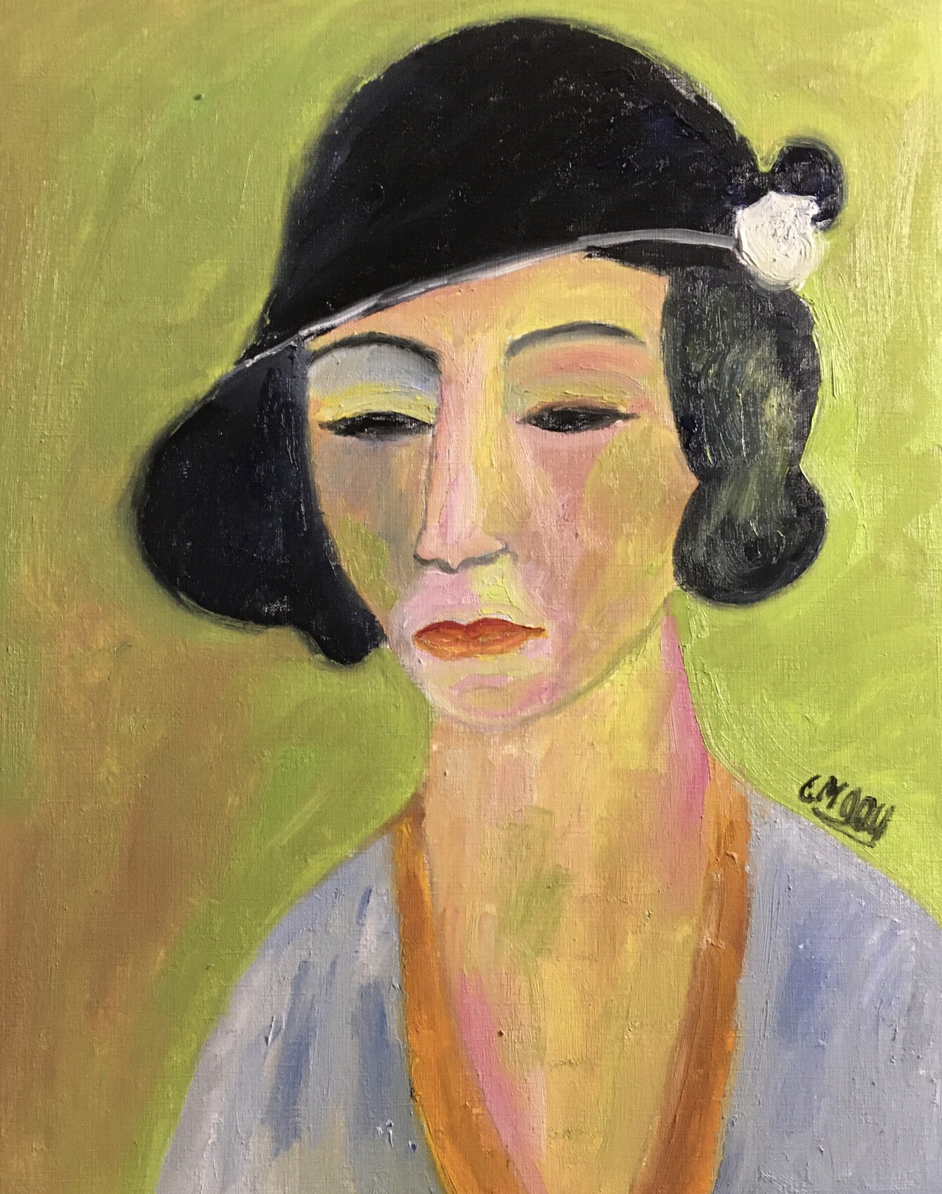 Huile sur papier 48/36. Le 04/09/21. Bien à vous, voici l'interprétation d'une toile d'Edouard Bisson "Portrait of a lady in a Hat Black. Amicalement, Claire.