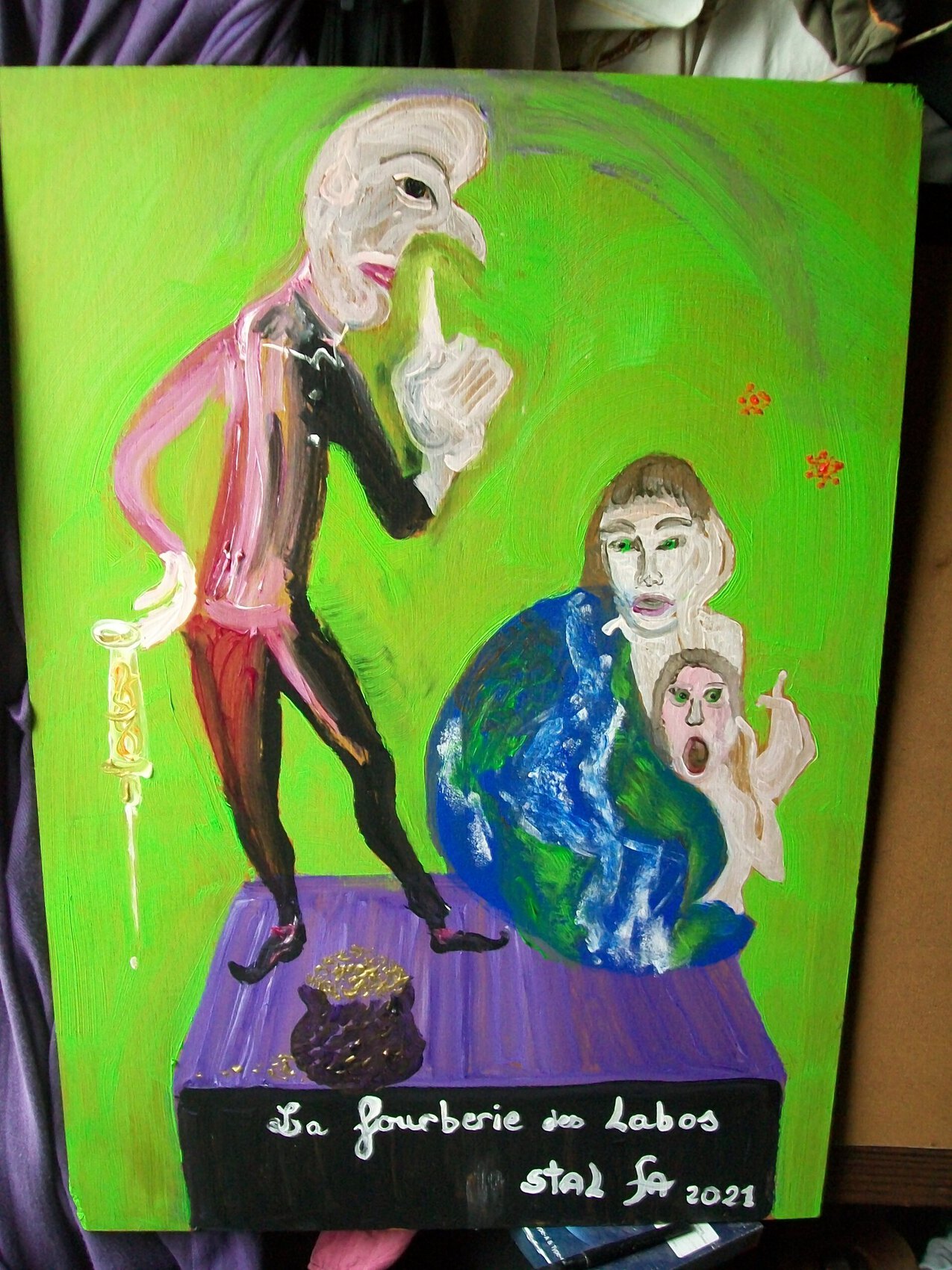 Acrylique sur panneau de bois contreplaqué de 72 cm par 52 cm par 1 cm , inspirée de : " Les Fourberies de Scapin " de Molière , et du fait que sans financement de notre sécurité sanitaire , nos médicaments sont fournis par d' autres qui nous imposent leurs conditions de marché ... Peint par Stal Fa , à Montpellier , Occitanie , France , le 22 février 2021 . ( temps trés pluvieux )