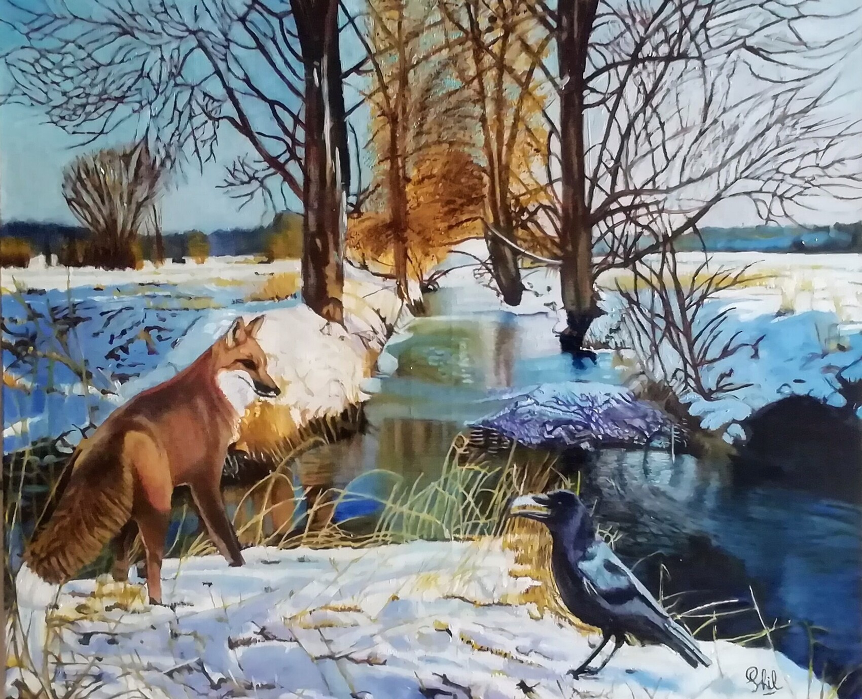 Dans un paysage enneigé, un corbeau et un renard revisite la fameuse fable.