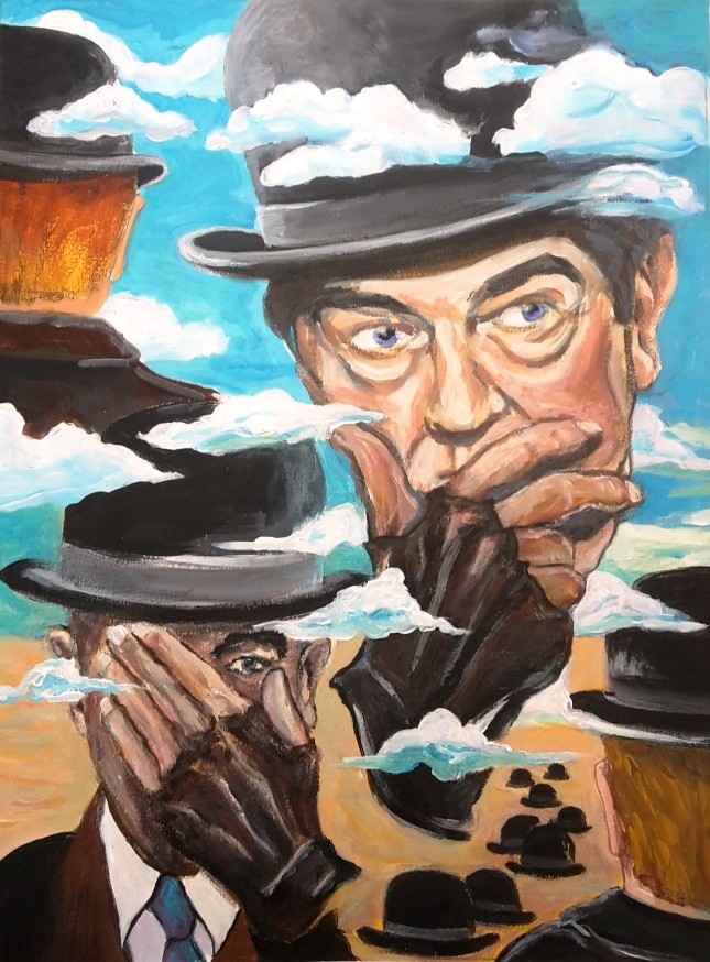 René Magritte, peintre surréaliste pour qui l'idée paradoxale prévalait sur le discours bourgeois Peinture acrylique sur papier Canson, format 26/35