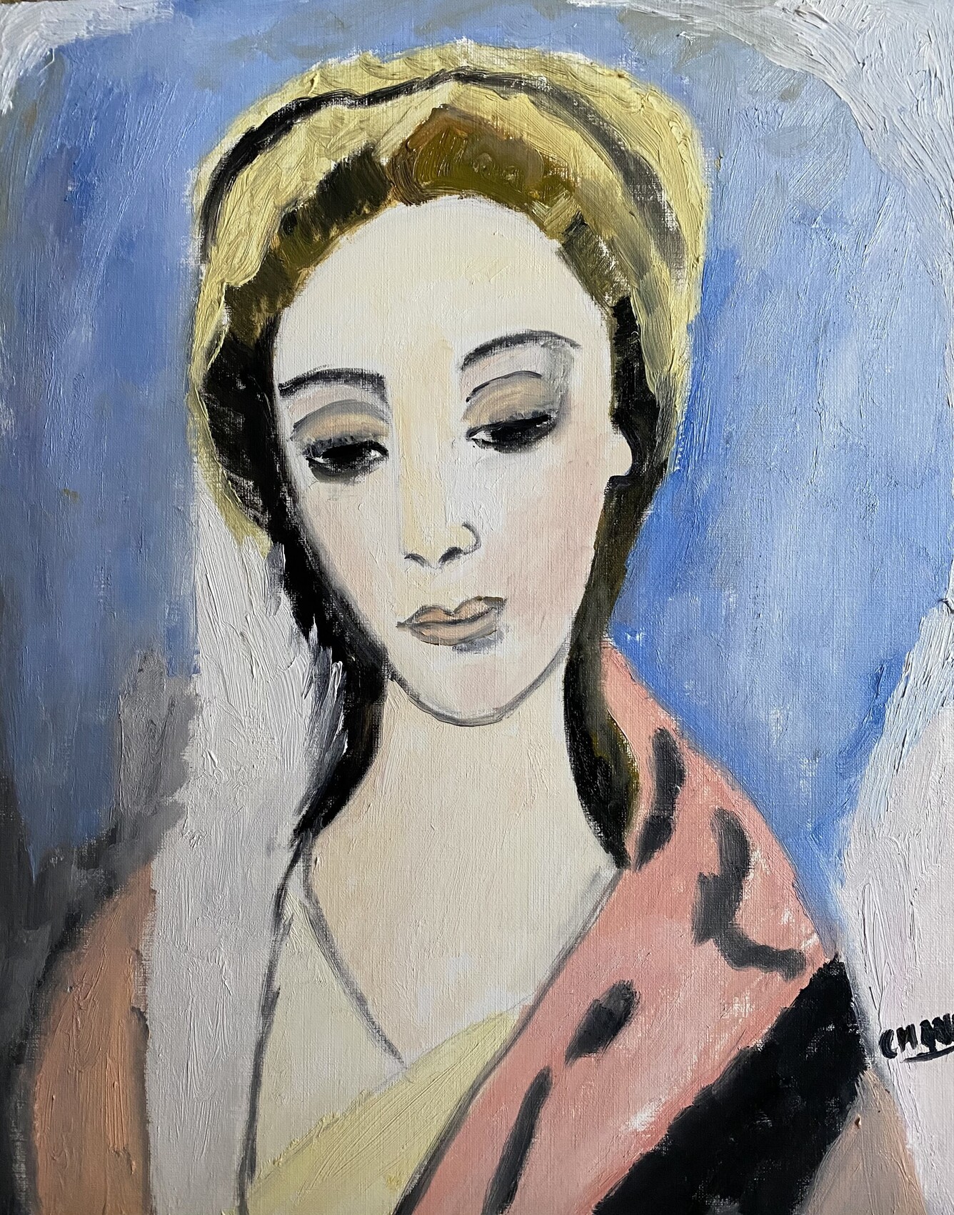 Huile sur papier 48/36. Le 22/10/22. Bien à vous, je vous présente la "Madre", inspirée de "La Sainte famille" du Greco. Amicalement, Claire.