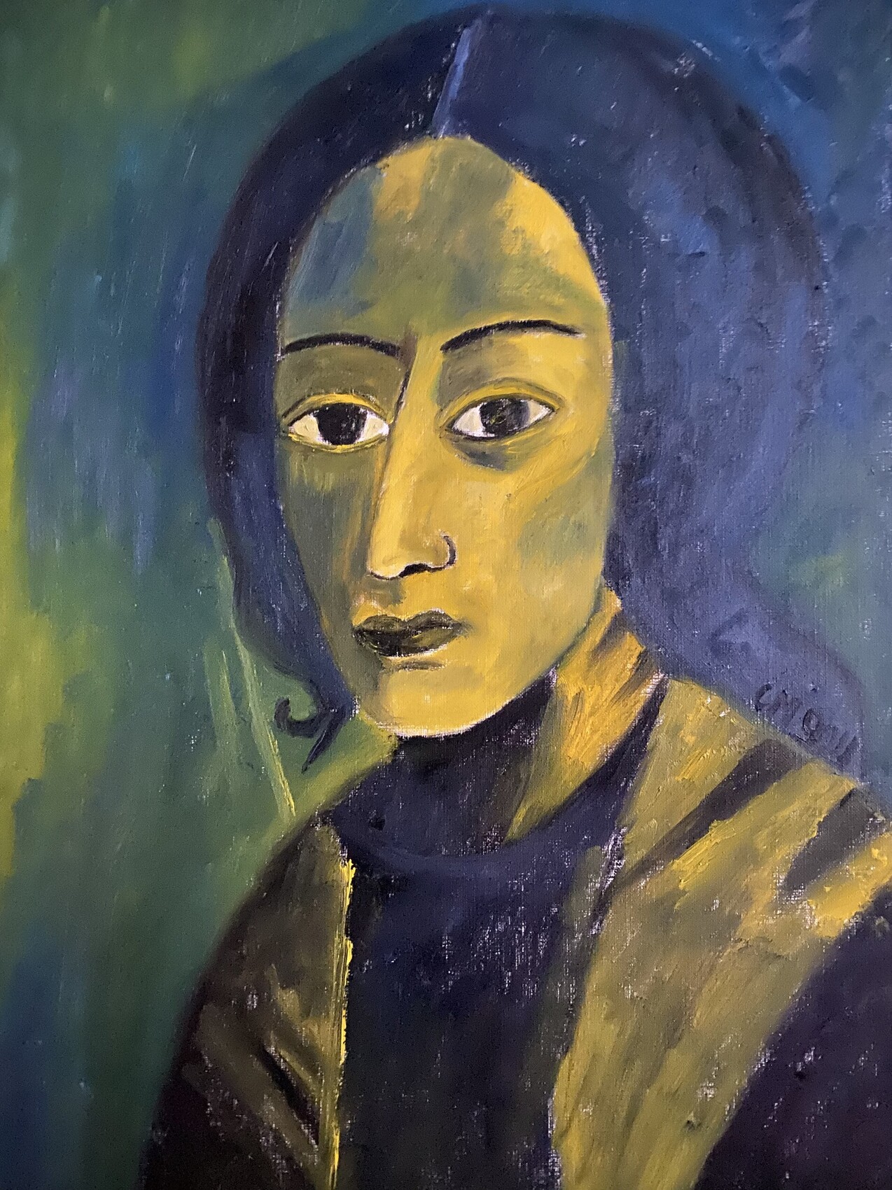 Huile sur papier 46/38. Le 23/10/23. Bien à vous, je vous présente "Mélancolie", une toile inspirée de celle de Picasso " La femme à la mèche". Amicalement, Claire.