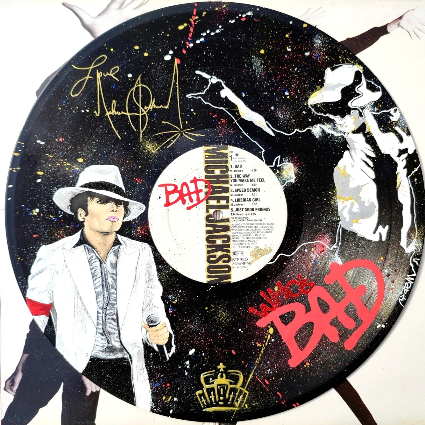 Création réalisée en 2022 entièrement à la main (sans pochoir) sur vinyle d'époque du célèbre Michael Jackson *BAD* -Jai voulu lui donné un côté Pop art et dynamique avec les éclats de plusieurs couleurs, j'ai utilisé les feutres peinture POSCA -Il y a de nombreux détails comme la signature de Michael Jackson, j'ai ajouté des paillettes dans certains éléments comme le chapeau,le pantalon,le "WHO'S" ... -30 CM × 30 CM -CERTIFICAT D'AUTHENTICITÉ -INSTAGRAM :@arts_of_monkey