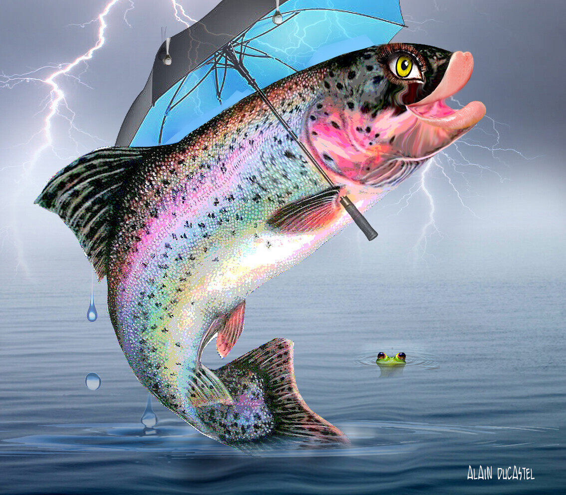 La truite ne craint pas la pluie car elle est bien équipée. De joie, elle fait des sauts de carpe car grâce a Truitter, elle organise des rencontres frétillantes...