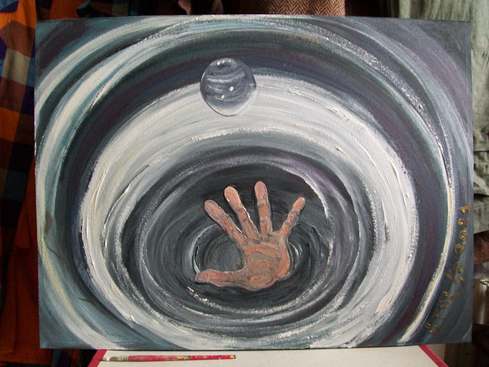 " L' abysse du changement climatique ... ( juillet 2021 ... ) . Et on ne pourra se raccrocher à rien ... Acrylique sur carton compressé de 60 cm par 44 cm par 0,5 cm , inspirée des pluies diluviennes qui ont ravageés en juillet 2021 : L'Allemagne , la Belgique et la Suisse . Le changement climatique ne va aller en s'améliorant , c'est certainement le plus terrible fléau ... Aprés l'eau , va venir le feu ... Peint par Stal Fa , à Montpellier , Occitanie , France , le 20 juillet 2021 . ( temps