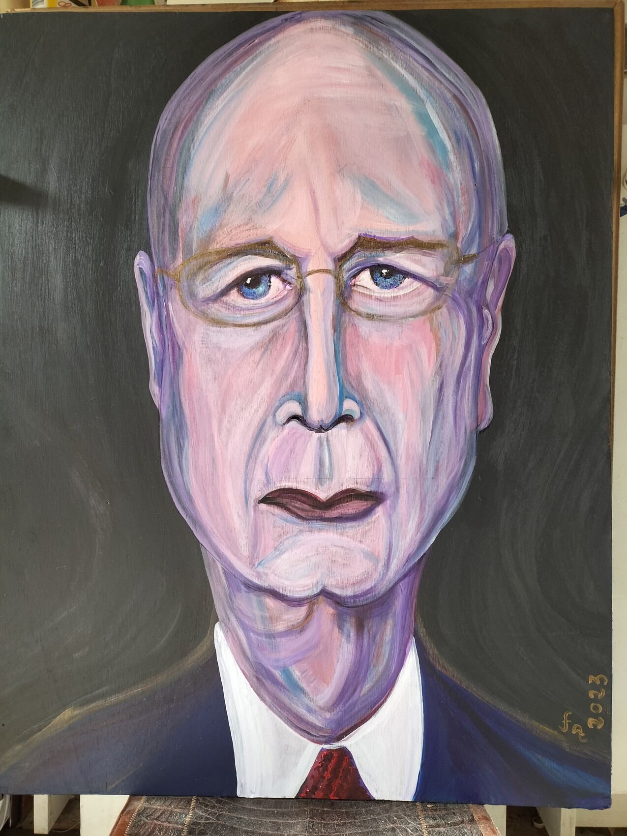 " Le nouveau führer .. " ( avril 2023 ) . Acrylique sur bois de 75 cm par 59 cm par 0, 8 cm , inspiré par l' énigmatique Président du Forum economique mondial : Klaus Schwab ... Non , nous ne serions pas heureux avec rien ! Qui le serait avec si peu ... ? Pourquoi personne n' ose vous répondre clairement ? Inspirez vous la crainte comme un nouveau führer ... ?
