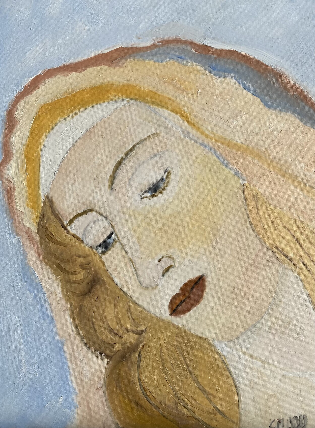 Huile sur papier 46/38. Le 04/09/22. Bien à vous, je vous présente "Vierge", inspirée de "La Vierge à l'enfant" de Botticelli. Amicalement, Claire.