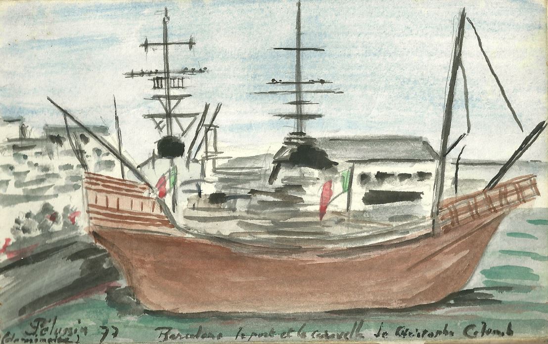 BARCELON Espagne Le Port et la caravelle de Christophe Colomb Type : marine 1977 Aquarelle Texier de Pélussin artiste peintre ( 1928 - 2008 )