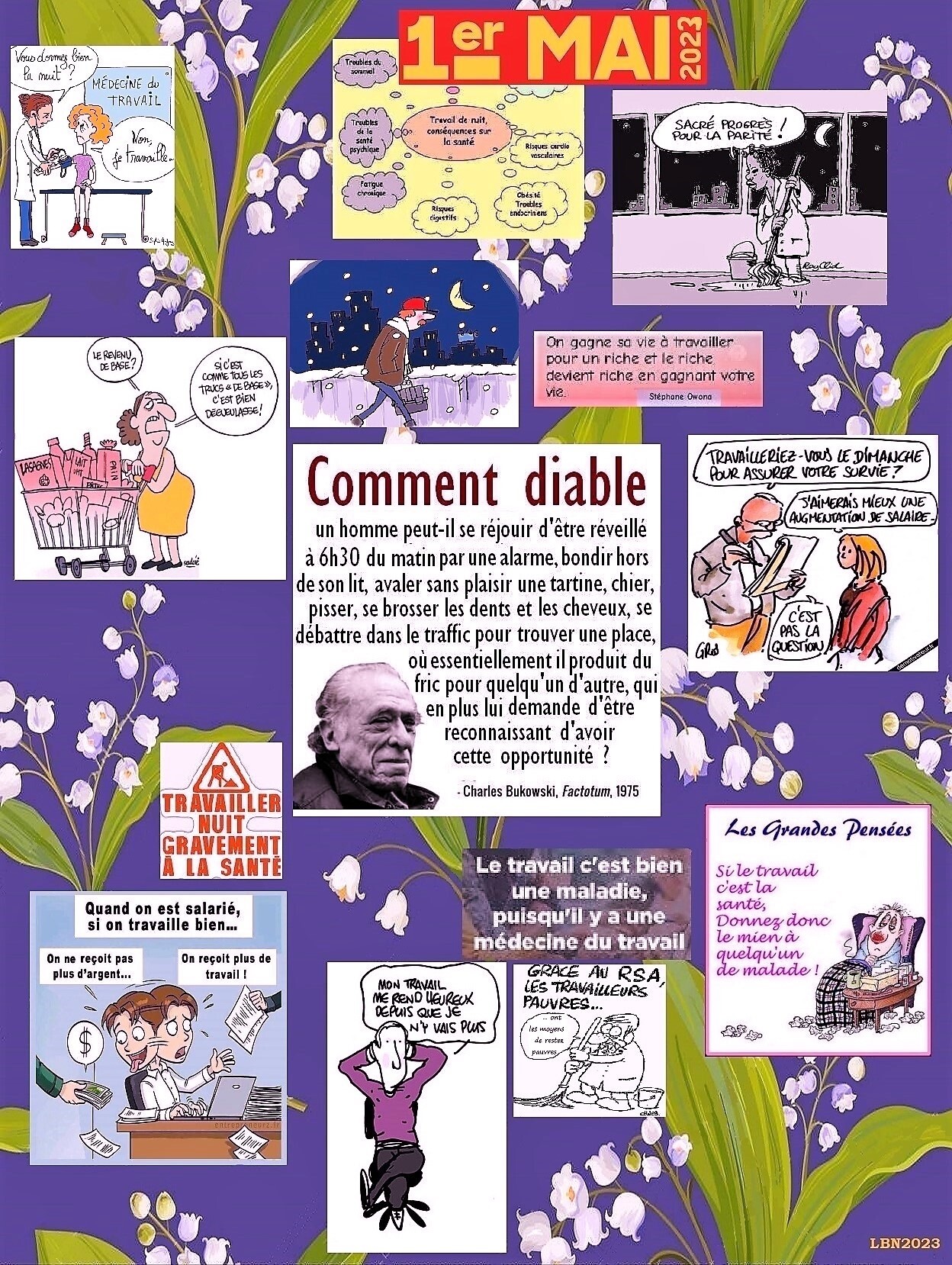 Salus Styloyne, j'ai aimé, ces légendes d'images, de la mode quotidienne de la vie tumultueuse, difficile, que vivent, la plupart des gens, j'ai aimé surtout en particulier, la citation morale de Mr Bukowski, certe, beaucoup ne connaissent pas, la valeur du travail, avec dignité et honneur, moi qui vous parle personnellement, je vais vous, dire en petit résumé, le côté sombre de la Mauritanie, je vis dans un pays, où, la plupart, de certains fainéants(es), paresseux , ne connaissent, pas, la vraie valeur du travail, car, ils sont couverts et protégés par des bras longs, ainsi, ils peuvent, rester 2 à 3 mois, voire pire jusqu'à 5, 6 mois, sans monter travailler, alors qu'ils/elles, continuent de percevoir leurs salaires indignes d'eux, parce qu'ils sont protégés et intouchables, et contrairement, à nous pauvres citoyens, qui travaillons, en faisant, les plus importantes tâches administratives de l'Etat ! ainsi, dire, que ces paresseux, veulent fêter la fête du travail, alors qu'ils/elles ne connaissent pas, sa vraie valeur, avec honneur, ça, c'est juste, peu de ce que je vous ai raconté, vous aussi, avez défini, à votre avis et vision, des choses, sur ce jour férié, en hommage du travail, bravo, illustrations riches en images qui en disent long, sur la vie quotidienne difficile, de chaque société.