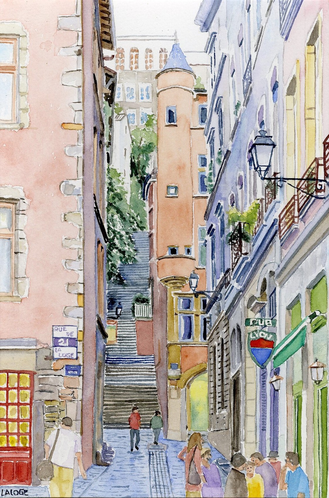 Aquarelle originale de la Rue de la Loge dans le Quartier Saint-Jean à Lyon D'autres aquarelles sont également disponibles sur mon site accessible en tapant : laurent laloge aquarelliste dans votre moteur de recherche. N'hésitez pas à le visiter et me contacter Aquarelle réalisée sur papier pur coton 300 g au Format 20 x 30 cm environ encadrée d'un passe partout en contrecollé blanc pour cadre standard de 30 x 40 cm.