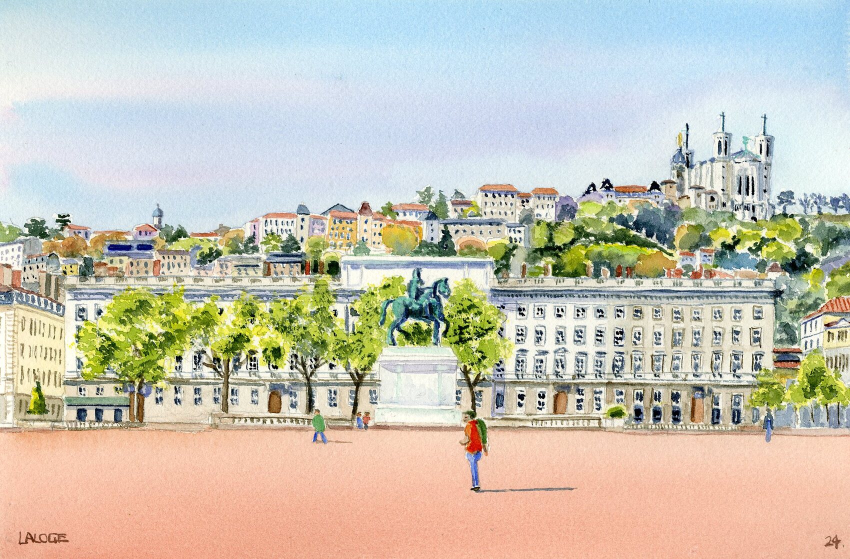Aquarelle originale de Lyon Place Bellecour Aquarelle réalisée sur papier pur coton 300 g au Format 20 x 30 cm environ encadrée d'un passe partout en contrecollé blanc pour cadre standard de 30 x 40 cm Un certificat d'authenticité et une facture sont fournis avec l'aquarelle