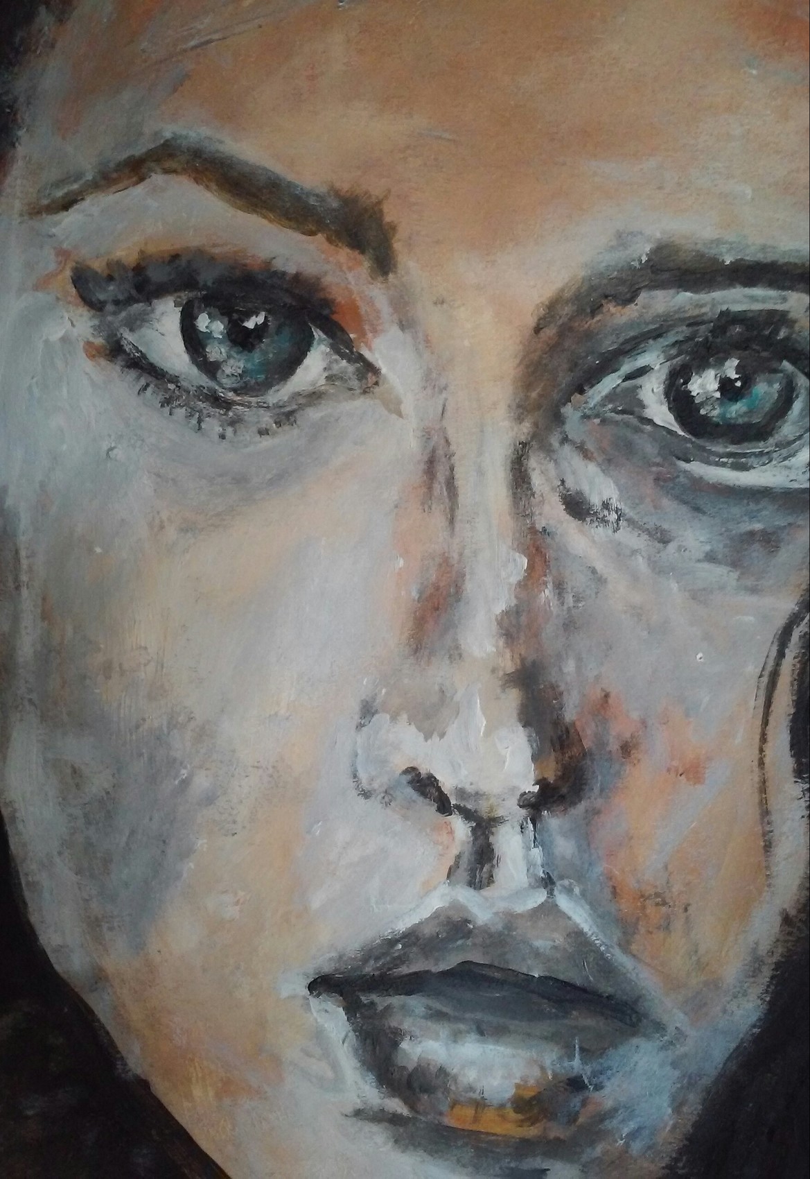 j'aime ce titre, parce que j'ai toujours pensé que c'est de nos angoisses qu'on parle avant tout dans nos toiles, en tous cas pour ma part, mais aussi qu'on les conjure ! encore une façon tellement affirmée de nuancer vos visages, un superbe portrait