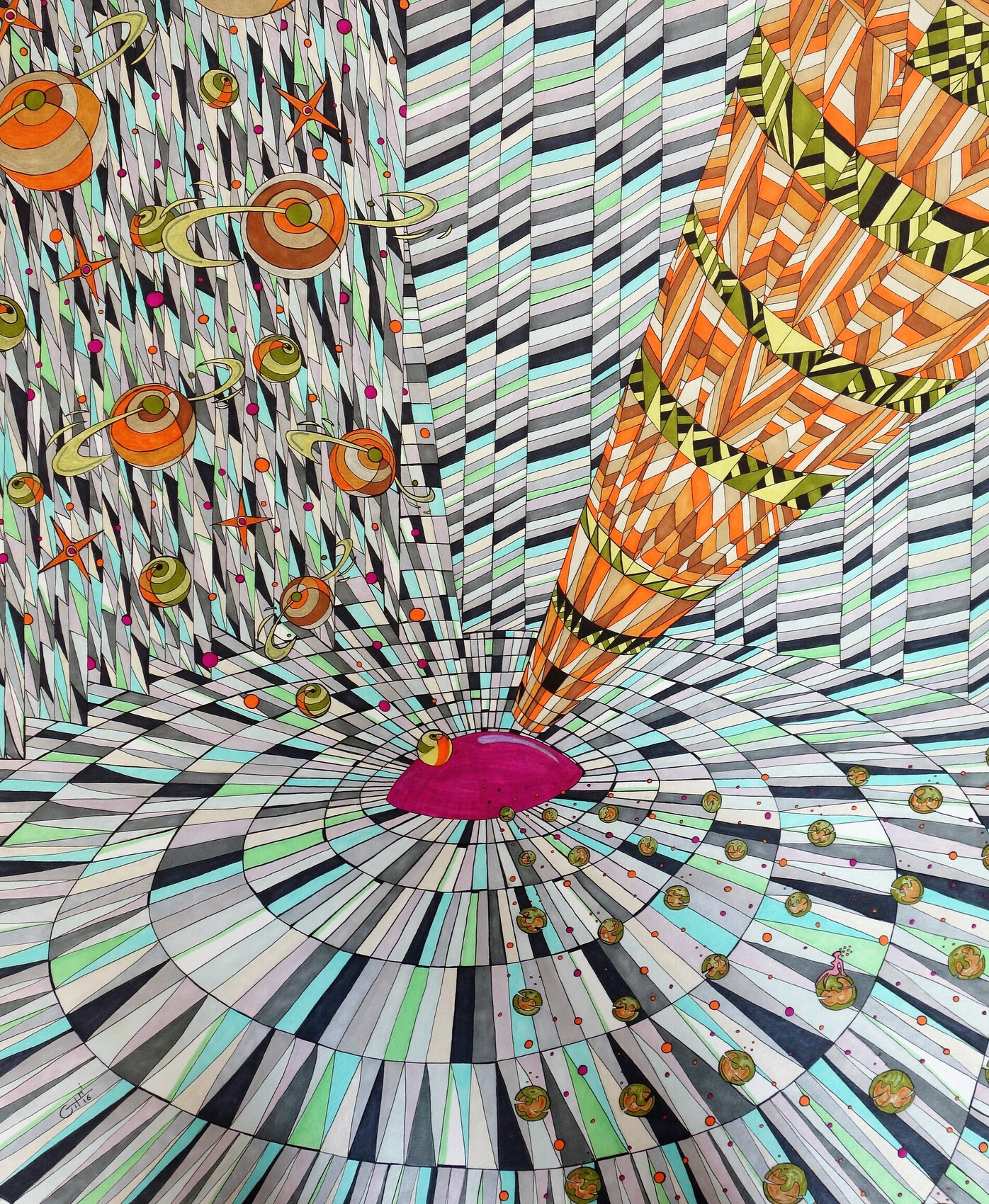 Quel travail ! quelle patience ! quelle imagination ! quelle technique ! on se sent pris dans le rouage et attiré, comme ce petit personnage rose. Bravo