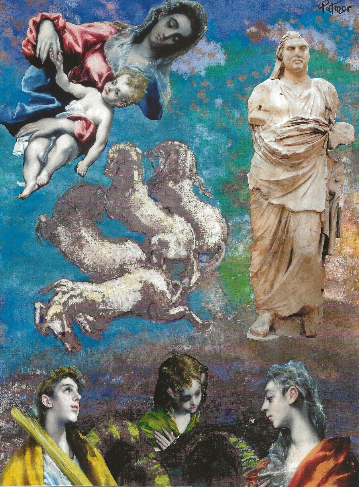 Assemblage et collages 2023 inspiré de Odilon Redon, Le Greco et autres "L'adoration est à la fois un acte intellectuel par lequel l'homme reconnait une puissance supérieure, et un acte d'amour par lequel il s'adresse à sa bonté." Emile-Louis Burnouf