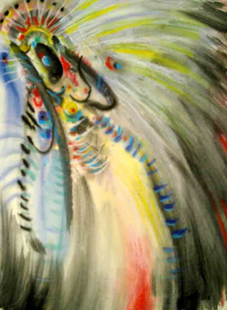 Aquarelle,exprimant un sorcier en transe quelque part en Afrique.