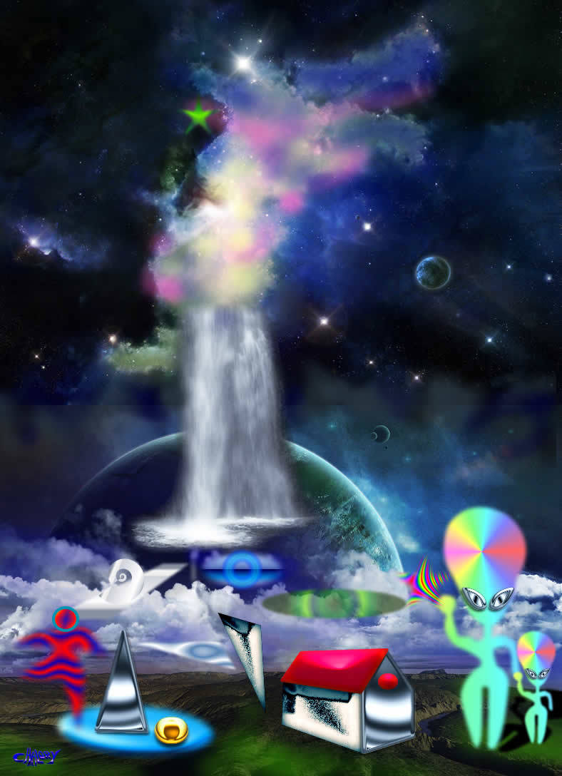Merci pour vos coms, le background est un montage de 2 images ''soudées'', et recolorisées, ajout d'étoiles, plus la ''chute d'eau ajoutée'', après, les effets spéciaux sont faits avec adobe fireworks.