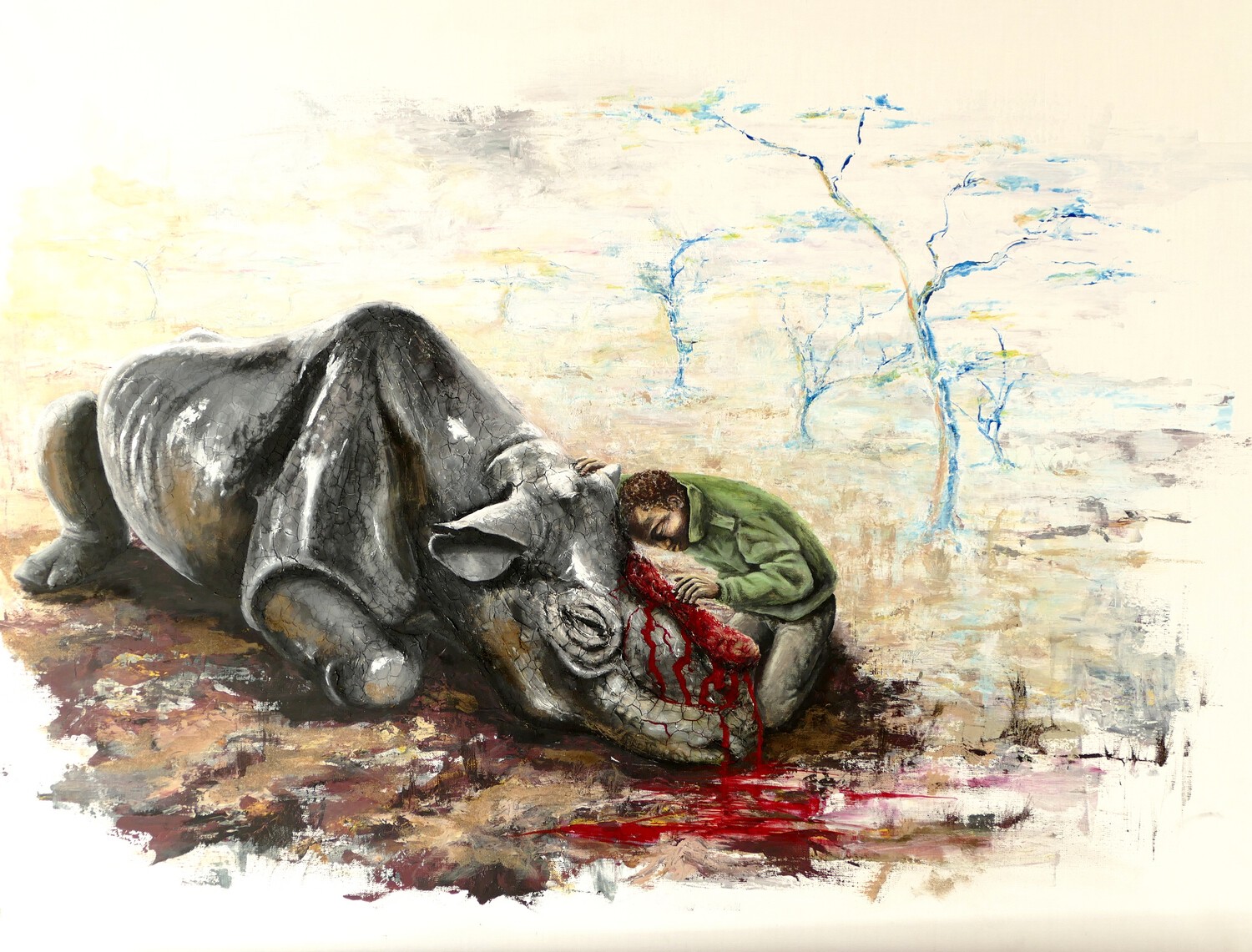 Un tableau mettant en parallèle l' homme et l' animal , la disparition de certaines espèces comme signe avant coureur de la disparition de l' homme si ce n' est physiquement au moins éthiquement. par sa déchéance morale et son exploitation mortifère de tous vivants.