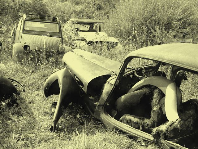 impossible d'expliquer pourquoi, mais ce genre de photo me fait craquer. Vieilles voitures devenues épaves, nostalgie, souvenirs devenus rouille...Bravo!!!