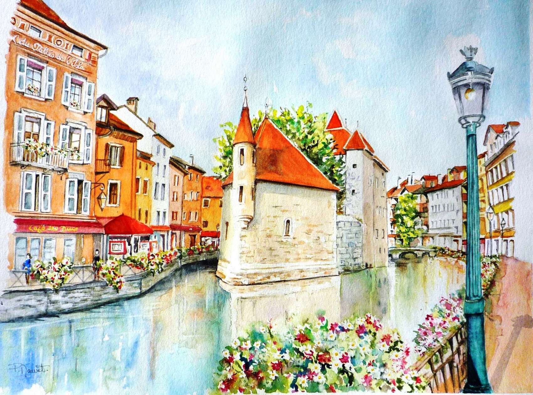Annecy Haute-Savoie, vue sur la vieille prison dit " Le Palais de L'ile ". Aquarelle 40x50