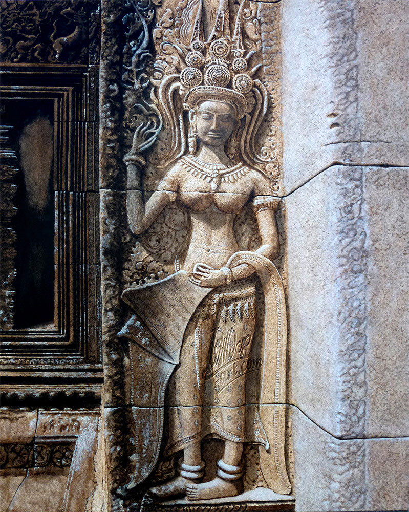 Tableau en trompe l'oeil d'une sculpture d'une apsara ornant les murs du temple d'Angkor Vat