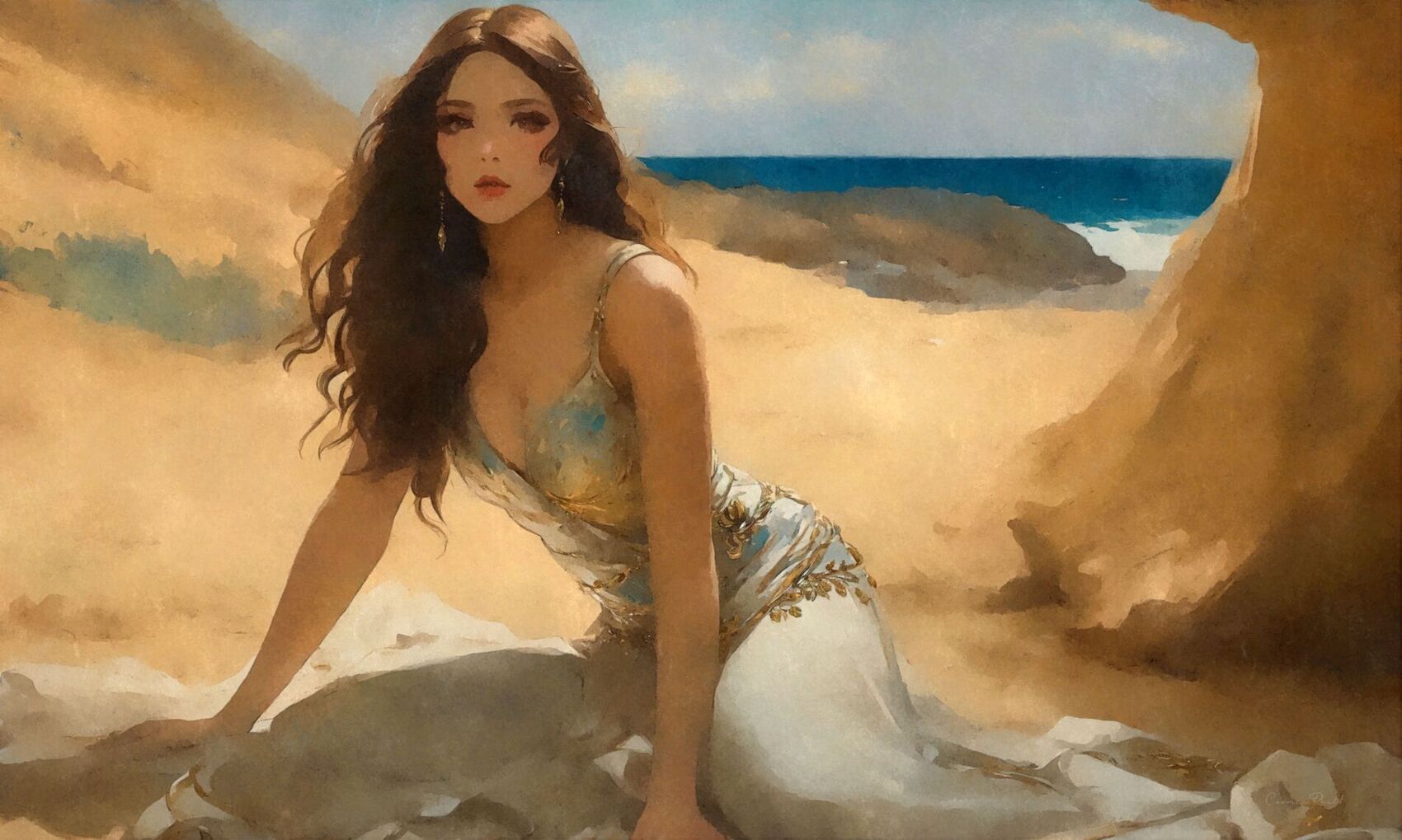 Voici, pour apaiser l'âme, de magnifiques beautés féminines, dessinées dans le style Manga, au bord de la mer, dans des aquarelles numériques à imprimer sur papier jusqu'au format 80 x 45