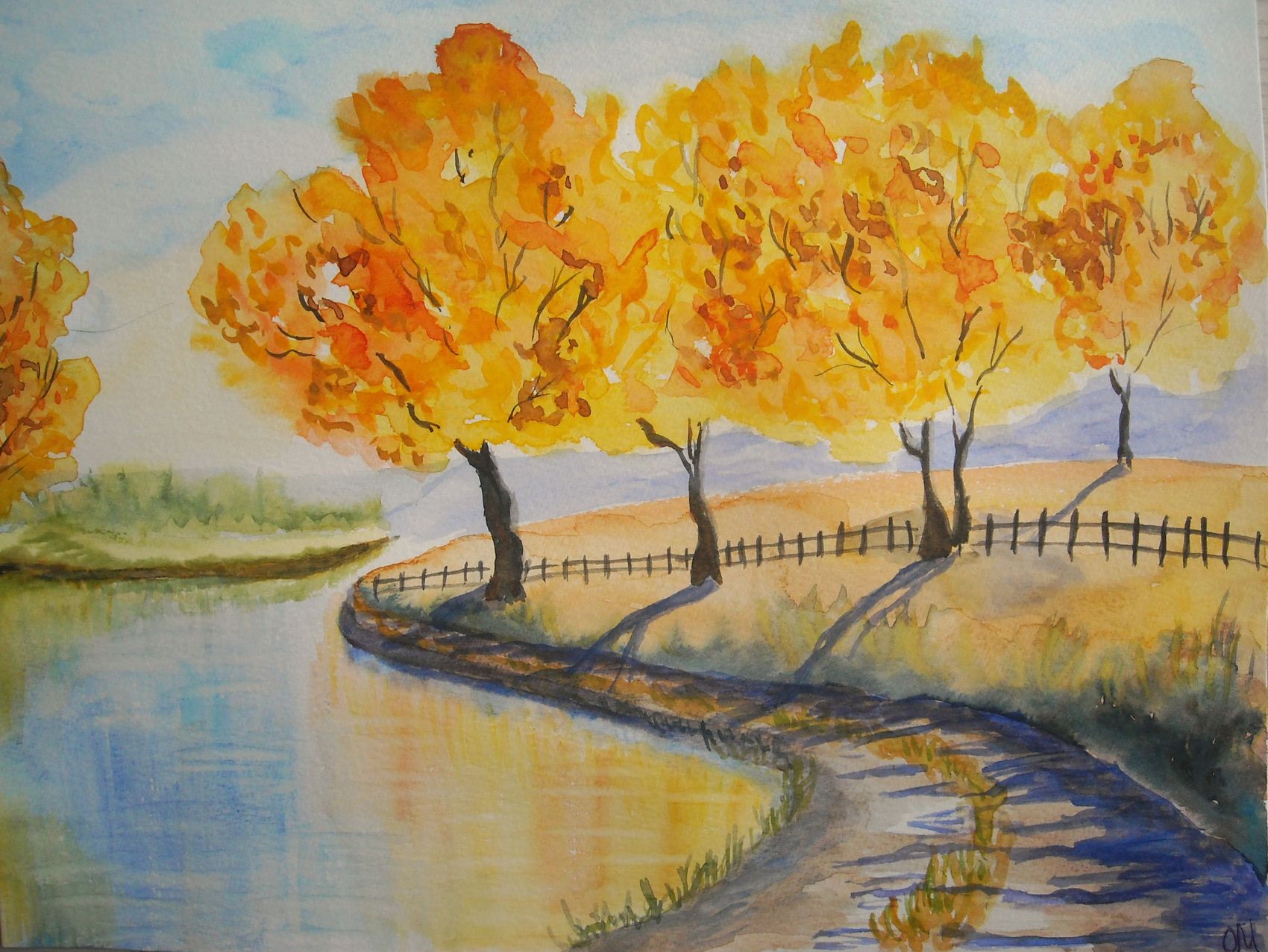 Aquarelle Paysage "Promenade au bord de l'eau" sur papier grain fin. Les dimensions de l'aquarelle: 24 cm * 32 cm. Signée, non encadrée.