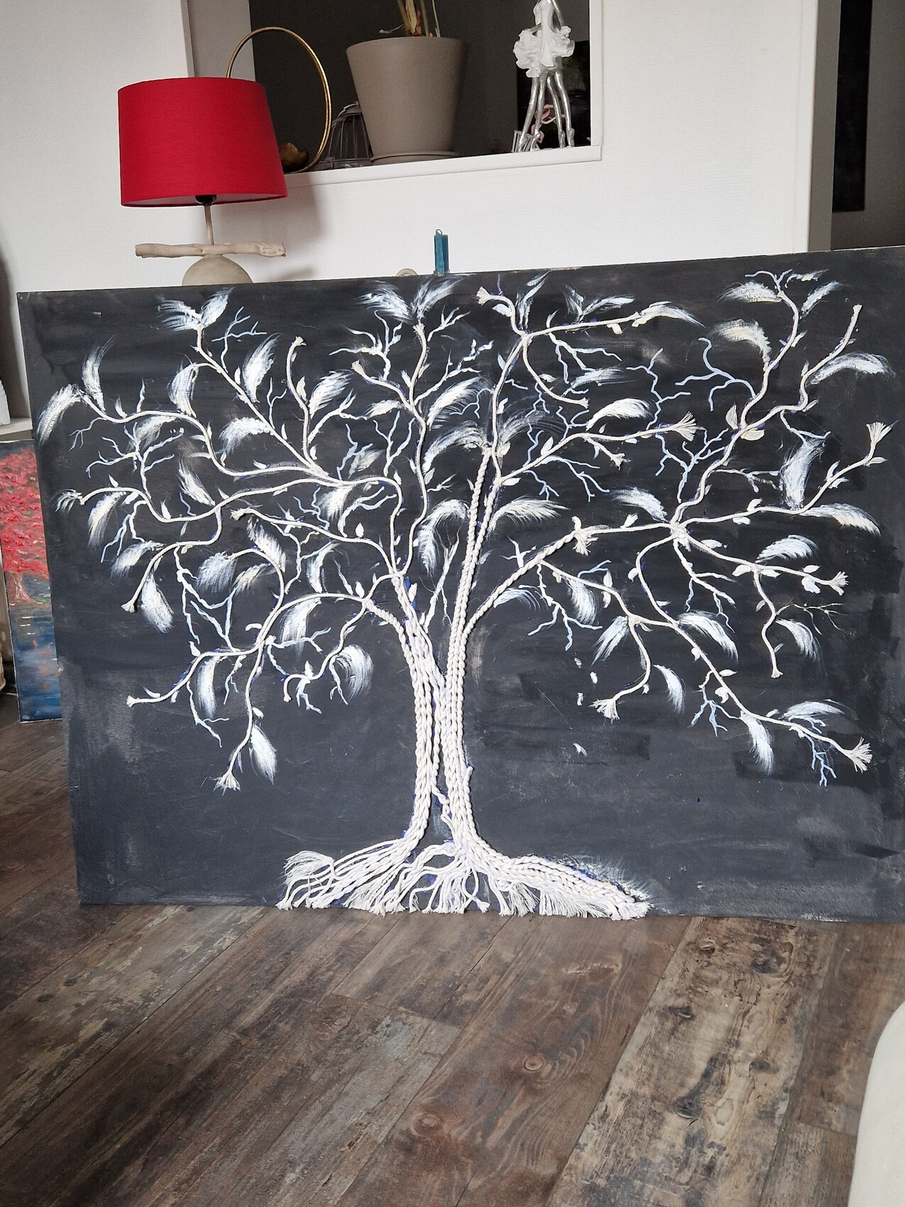 Terminer il est fait de ficelle et peinture acrylique. Il fait 1.20 sur 0.90
