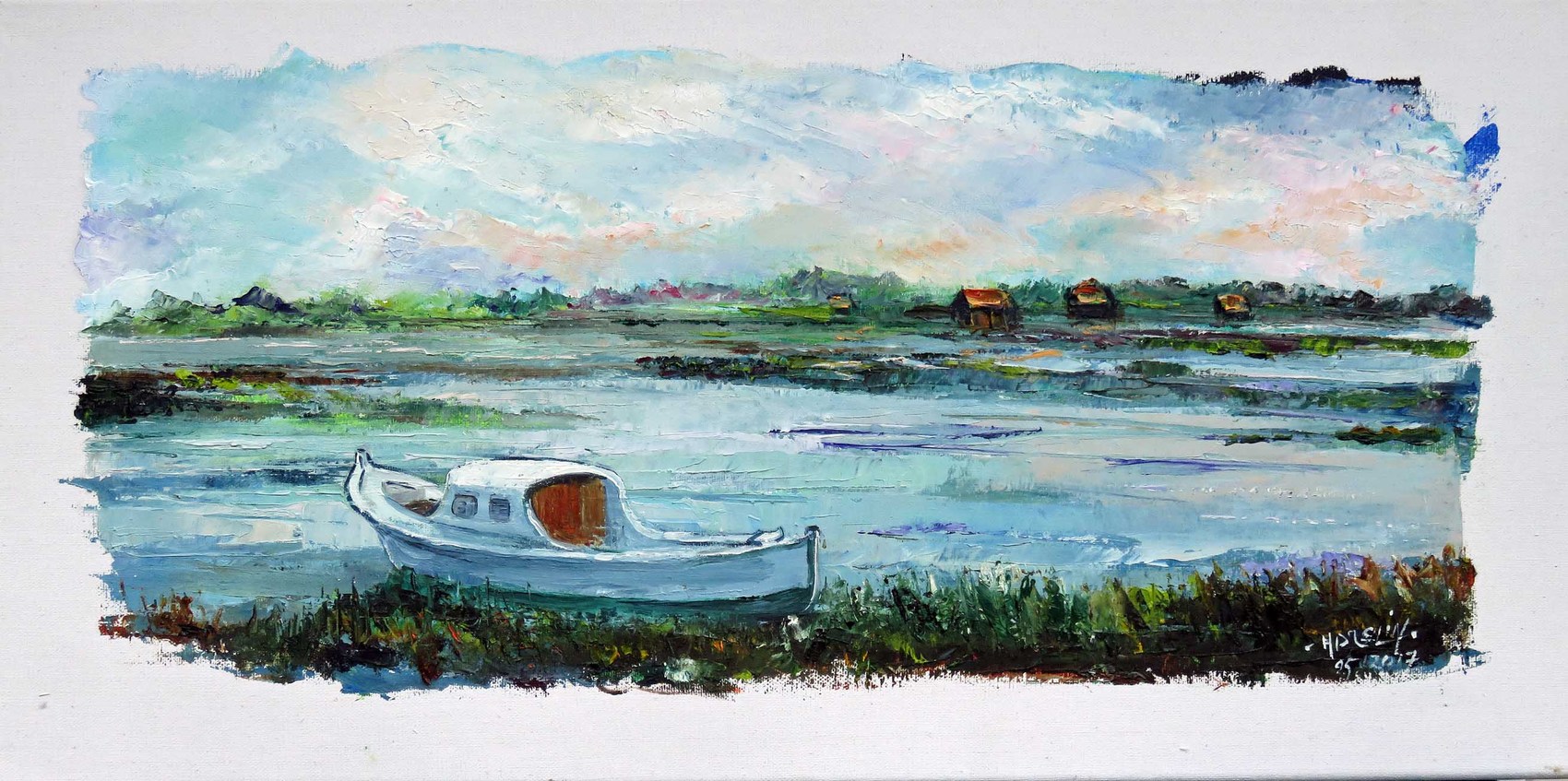 Huile sur toile travaillée au couteau de 30x60 cm, œuvre unique. Une pinasse échouée sur l'Ile aux oiseaux dans le bassin d'Arcachon attend la marée pour repartir. L'envoi est fait dans un emballage adapté sur mesure. Les frais d'envoi sont calculés au coup par coup en fonction des tarifs postaux.